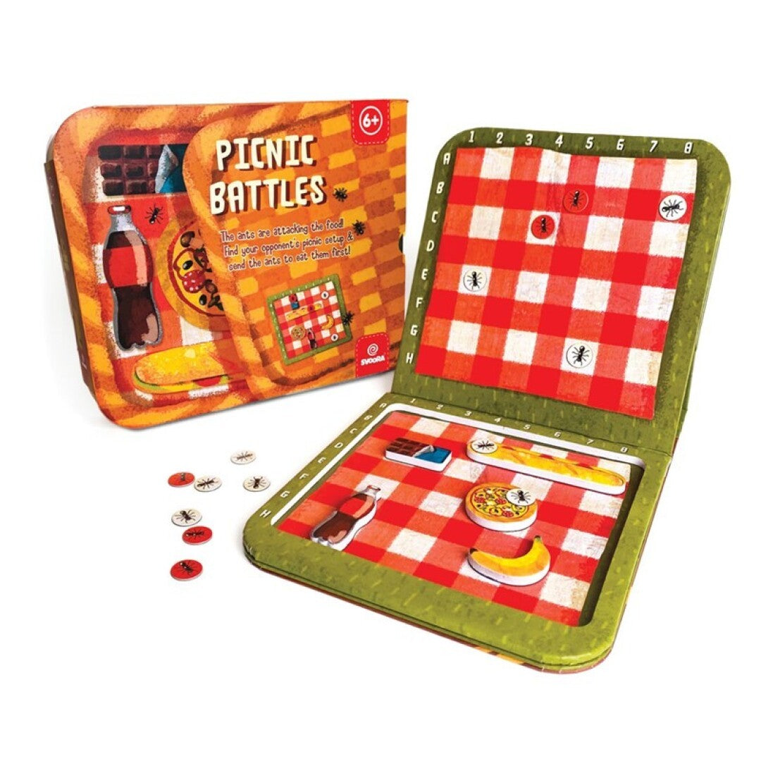 Picnic Battles es un juego magnético para 2 jugadores que desarrolla el pensamiento estratégico junto con el apetito. Un juego de viaje con la mecánica del clásico Hundir la Flota.