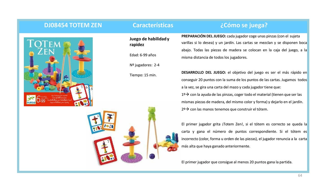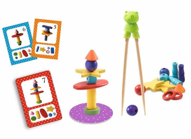 Incluye: 64 piezas de madera con formas y colores variados, 26 cartas con retos, 4 pinzas y 4 platos.