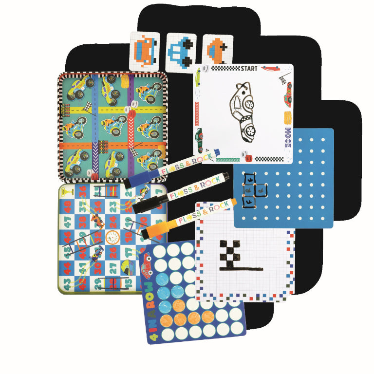 El juego magnético "Cars" de Floss & Rock es una lata compacta llena de actividades para los pequeños fans de los coches. Contiene hasta 6 juegos en uno, como Serpientes y Escaleras, Rueda y Cruz o 4 en raya. Con elementos magnéticos y rotuladores de borrado en seco, el juego es perfecto tanto para viajar como para casa.