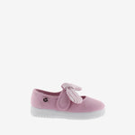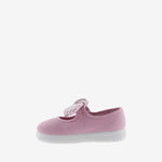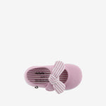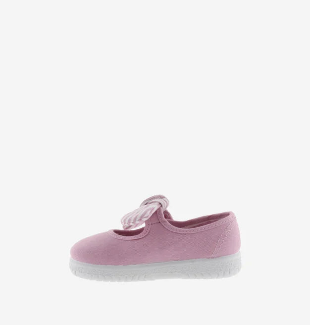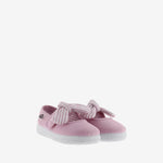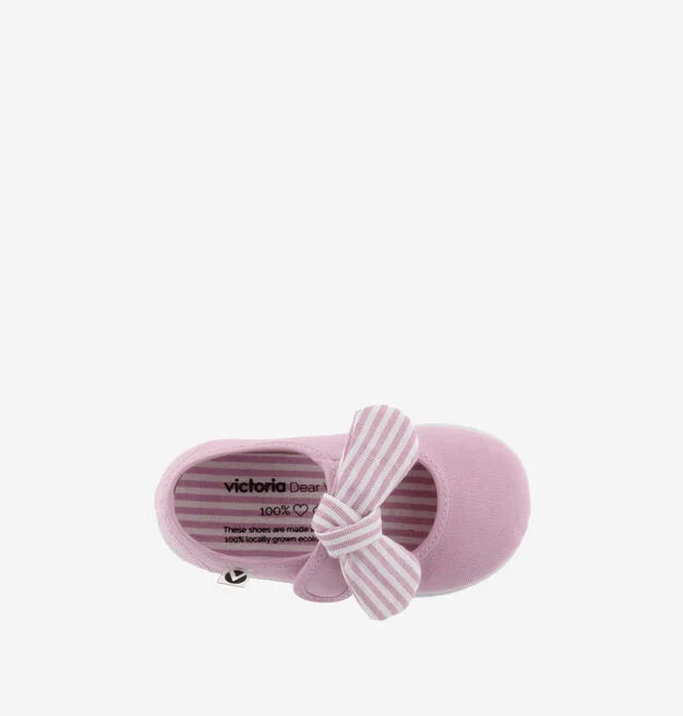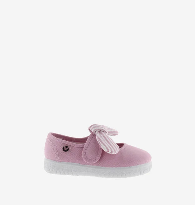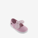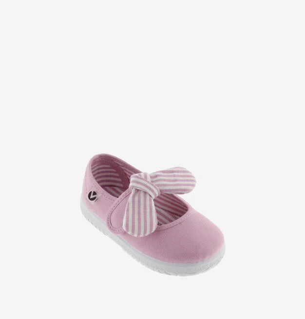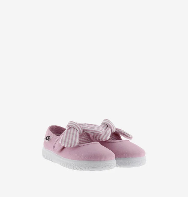 Merceditas para niños fabricadas en España en lona de algodón ecológico. Incorporan cierre con tira adherente para un ajuste fácil y seguro, que se acompaña de un pañuelo de rayas extraíble. Suela flexible de caucho vulcanizado.