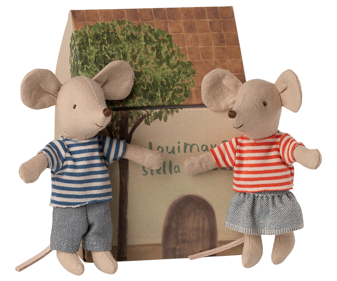 LouiMax y su hermana Stella están fabricados en tamaño hermana y hermano pequeños, y encajan perfectamente en la casa SuitCasa. Cuando los compras, vienen en una casa aún más pequeña.