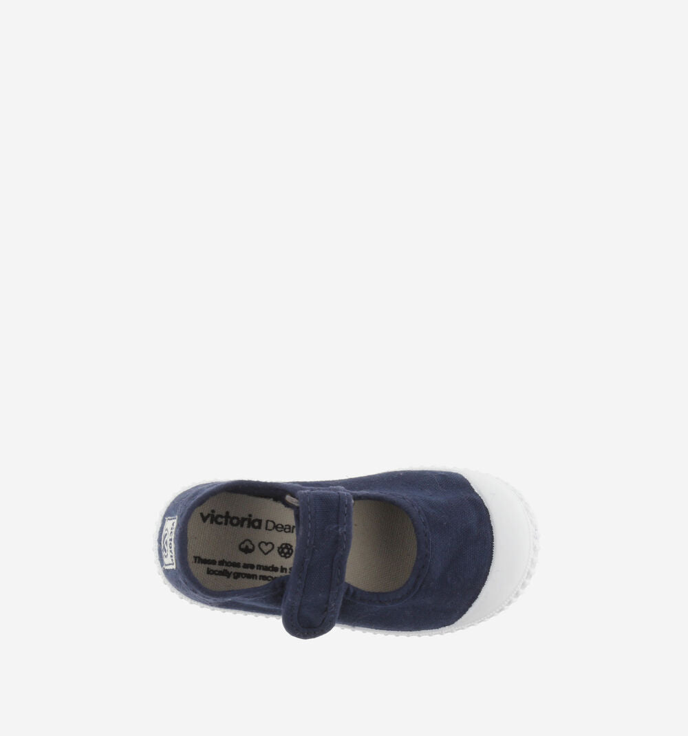 Merceditas de lona color marino para niña fabricadas en combinación de algodón reciclado DREC® (Dyeable Recycled Eco Cotton) y algodón ecológico cultivado, hilado y tejido en España. Llevan puntera de goma y cierre mediante tira adherente que fomenta la autonomía de los niños para calzarse. Modelo sostenible que cuenta con materiales reciclados en su composición. Incluye una plantilla interior para mayor confort y son muy fáciles de lavar.