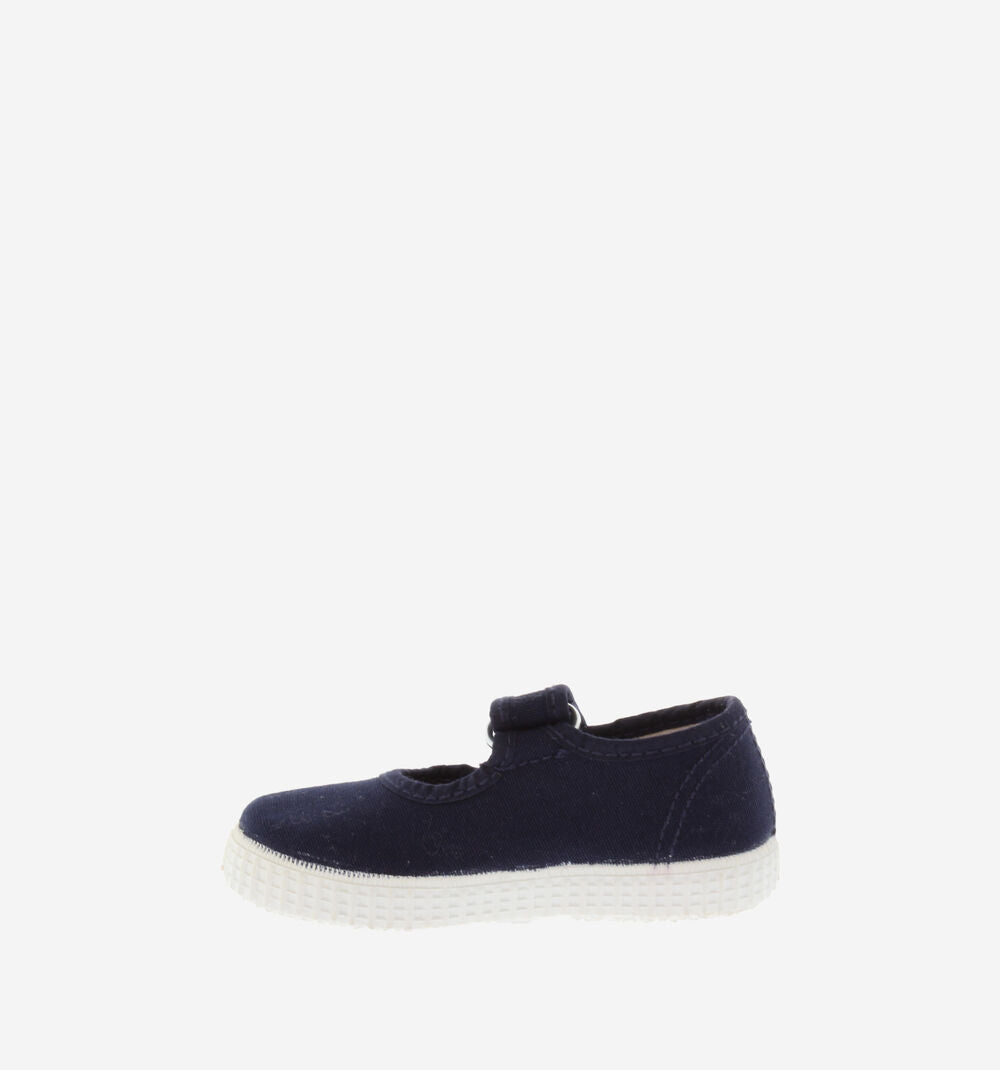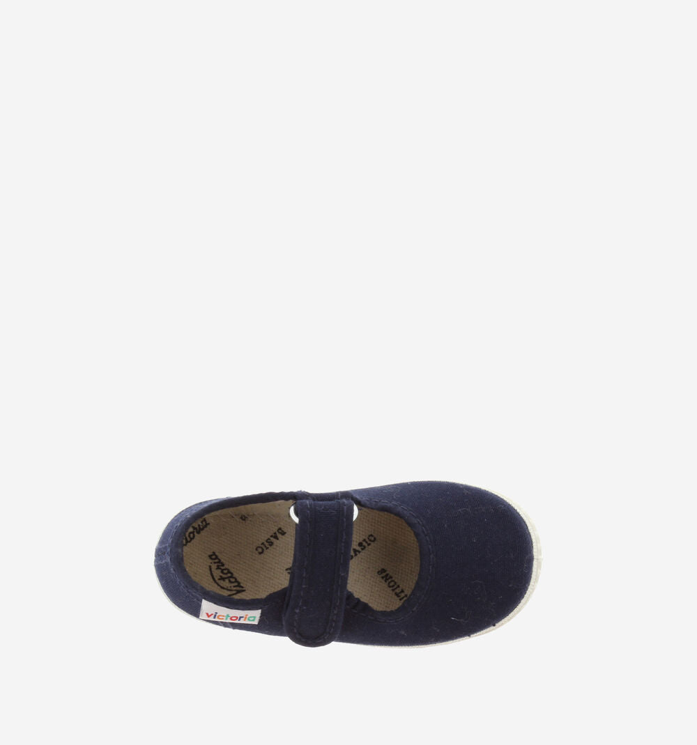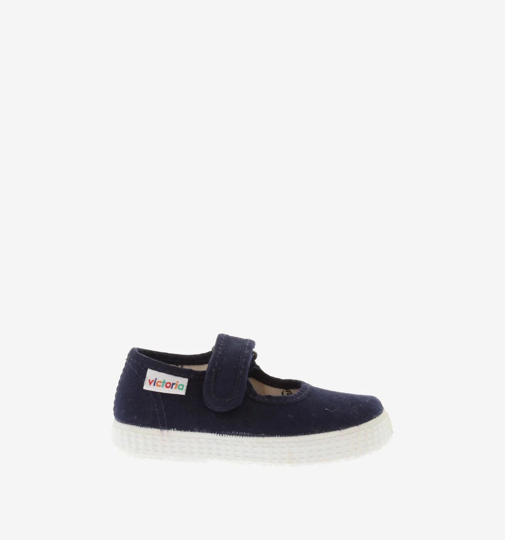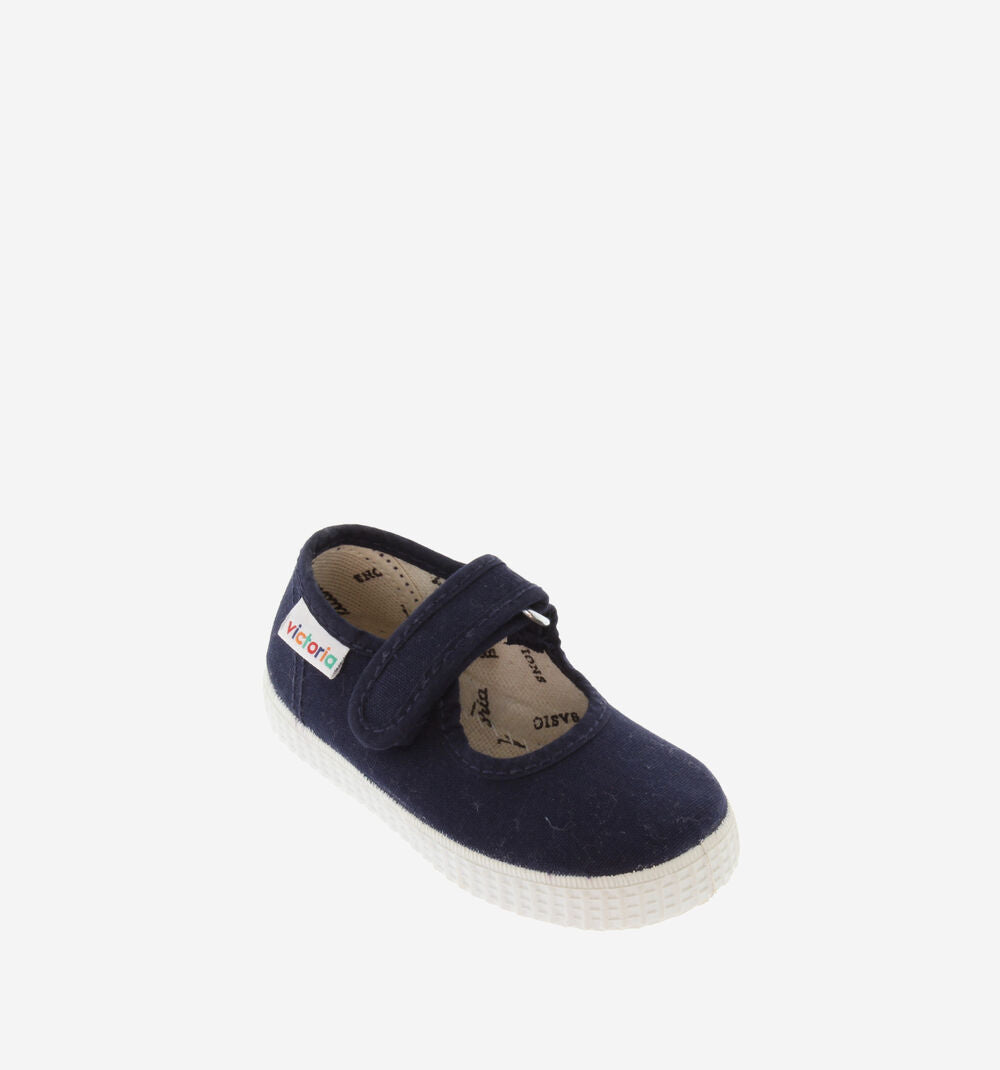 Merceditas de lona marino para niñas fabricadas en España con algodón ecológico. Etiqueta de victoria en el lateral y cierre mediante tira adherente que facilita el calce. Se adapta muy bien a niños con el empeine más ancho.