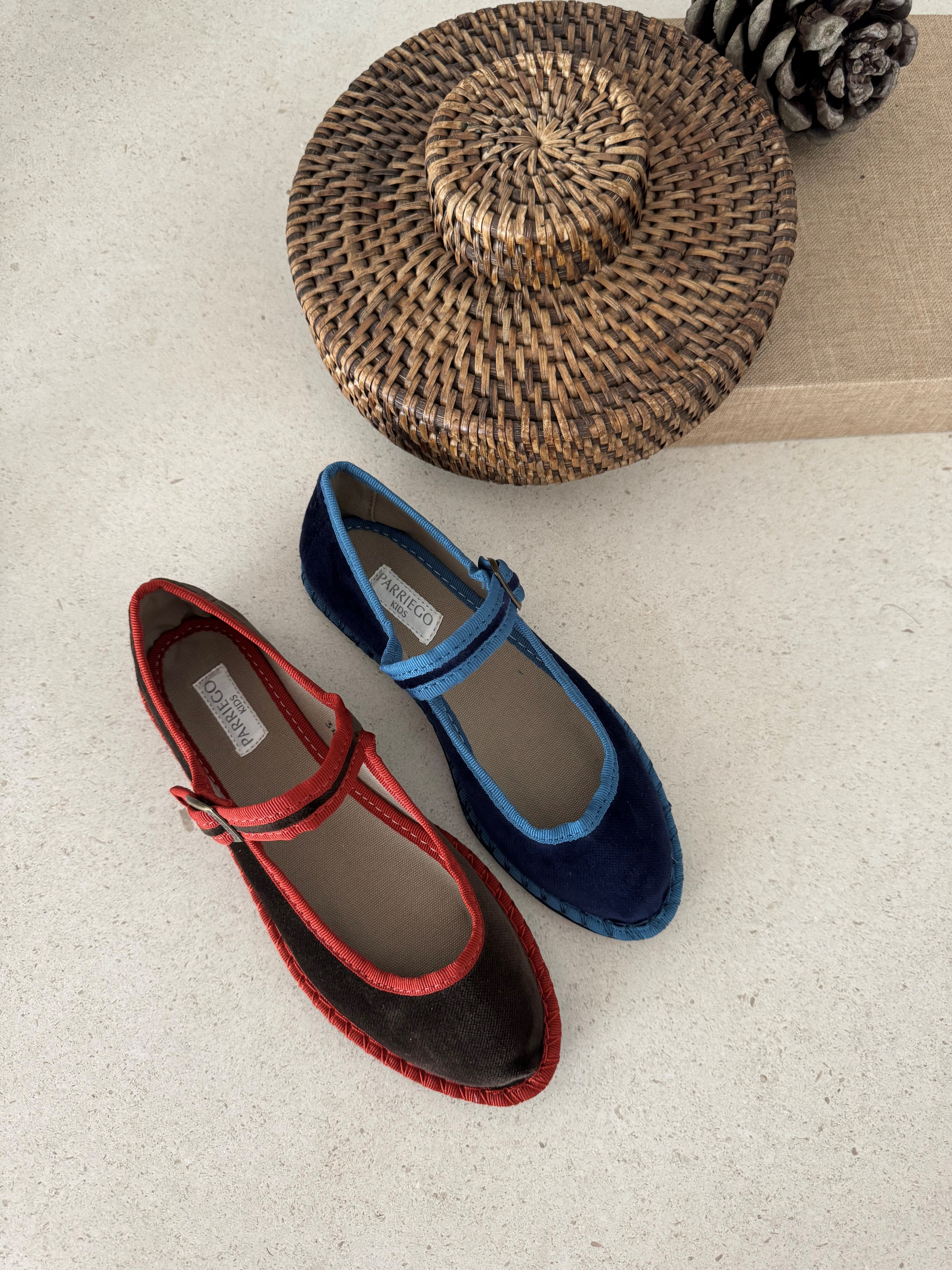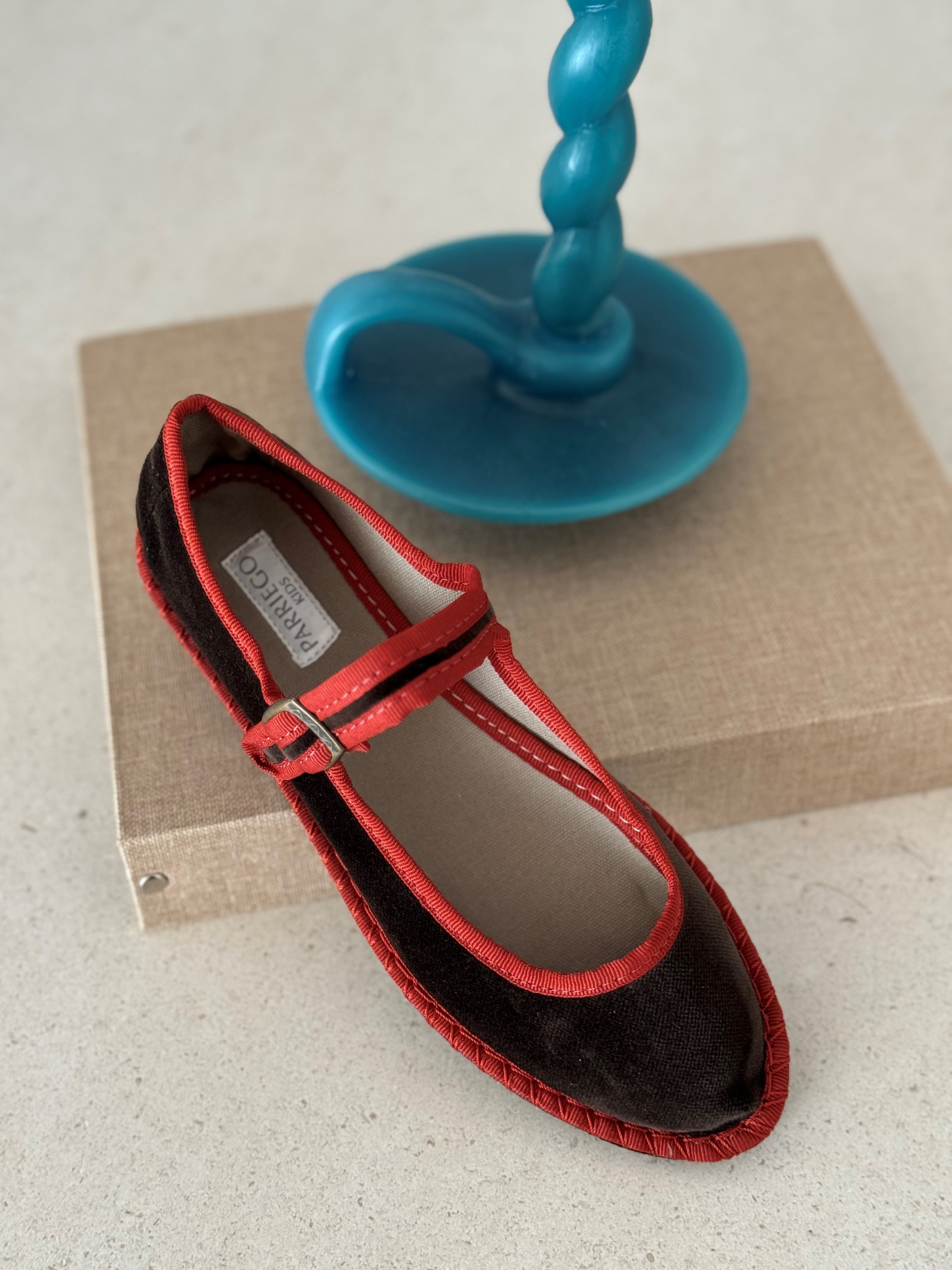 Esta mercedita de terciopelo estilo veneciana está disponible en 2 estilosas combinaciones: marrón chocolate con ribete naranja y azul marino con ribete azul. Tallan justas, recomendamos elegir una talla más.