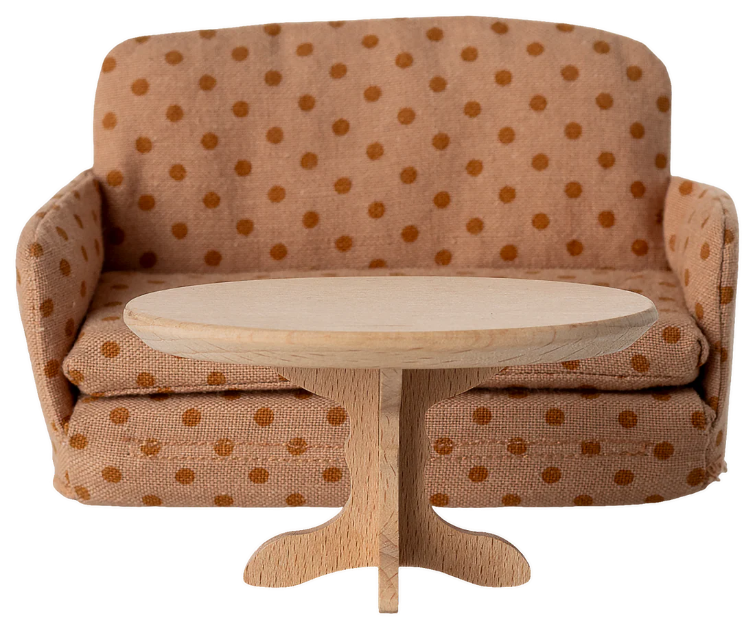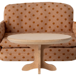 Una mesita de café de madera que se ajusta a la perfección al sofá cama en tamaño ratón. Esta mesa es ideal para SuitCasa y sin duda será el lugar perfecto para disfrutar de una agradable merienda o tomar un café.