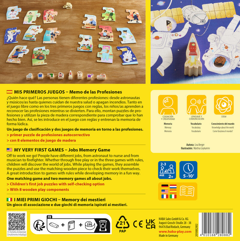 Astronautas, músicos, bomberos, cocineros, etc. Son muchas las profesiones y aún más lo que se necesita para llevarlas a cabo. En este juego los niños y niñas más pequeños aprenderán qué se necesita para realizar determinados trabajos, al tiempo que amplían su vocabulario y trabajan la memoria. Como todo los juegos de la colección Mis primeros juegos, este título presenta varias variantes, incluido el juego libre y la construcción de puzzles. Además, se puede jugar de forma cooperativa y competitiva, con opciones de juego de memoria y de clasificación.