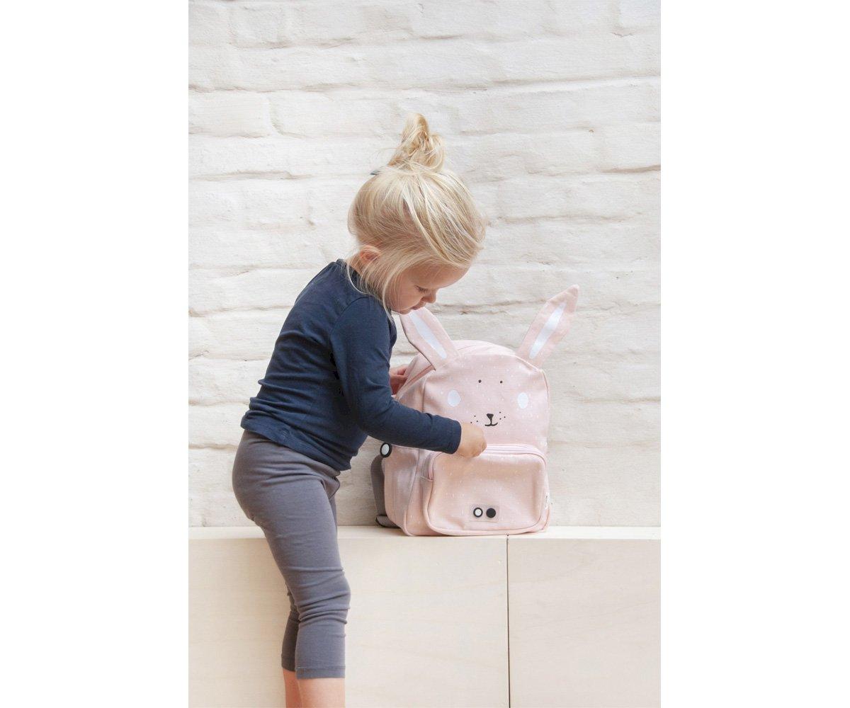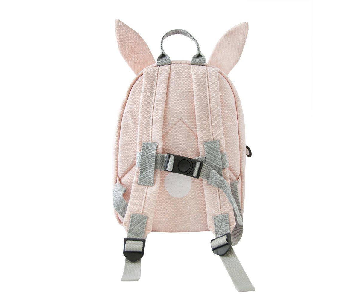 Esta mochila tiene un bolsillo delantero, y sus asas son acolchadas y ajustables. Tiene cierre con clip en el pecho para que al niño no se le caigan las asas. Tiene un bolsillo interior, y una etiqueta de tela para escribir el nombre del niño. Es perfecta para niños de 2 a 5 años. Las mochilas Trixie Baby están fabricadas de algodón 100% con un revestimiento acrílico repelente al agua.