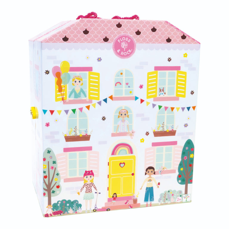 Una preciosa caja de juegos con personajes de madera brillantes y pintados. Incluye una bolsa de algodón con 18 increíbles piezas de madera de doble cara. La casa se abre para revelar 6 preciosas habitaciones, todas ilustradas a mano. Hay un baño, un dormitorio, una cocina, una sala de estar y mucho más. Coloca a tus personajes por la casa y deja volar tu imaginación.