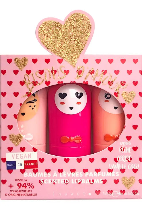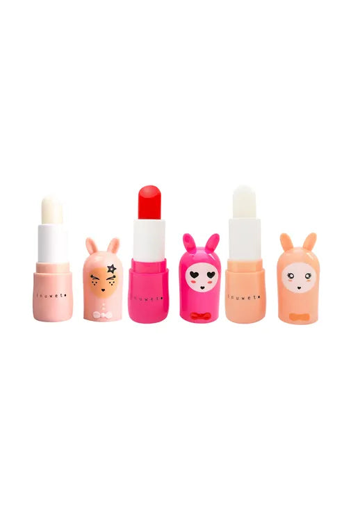 Set de 3 bálsamos de labios con temática de conejitos suavemente perfumados y enriquecidos con manteca de karité y aceite de macadamia que nutrirán, repararán y protegerán los labios.