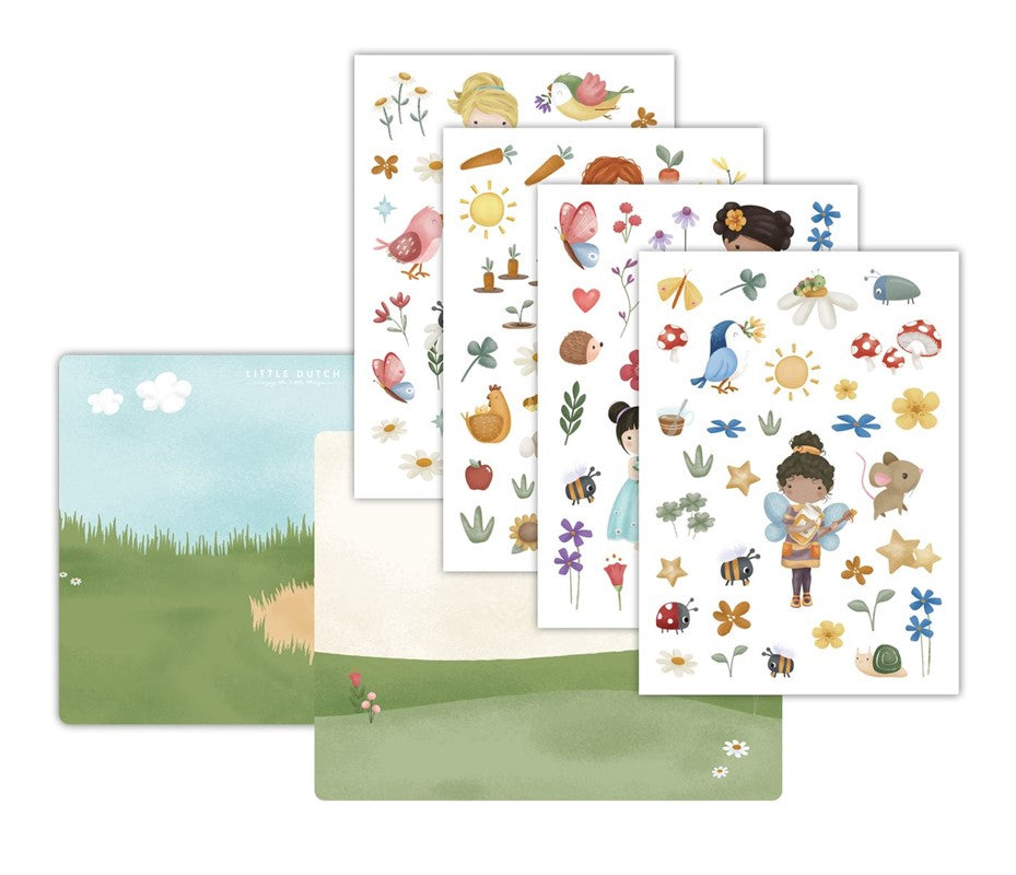 Blister que contiene 4 hojas de pegatinas estáticas y un escenario. Fáciles de despegar, se pueden reutilizar, aptas para cualquier superficie lisa, por ejemplo: ventanas, espejos, objetos de vidrio, baldosas.