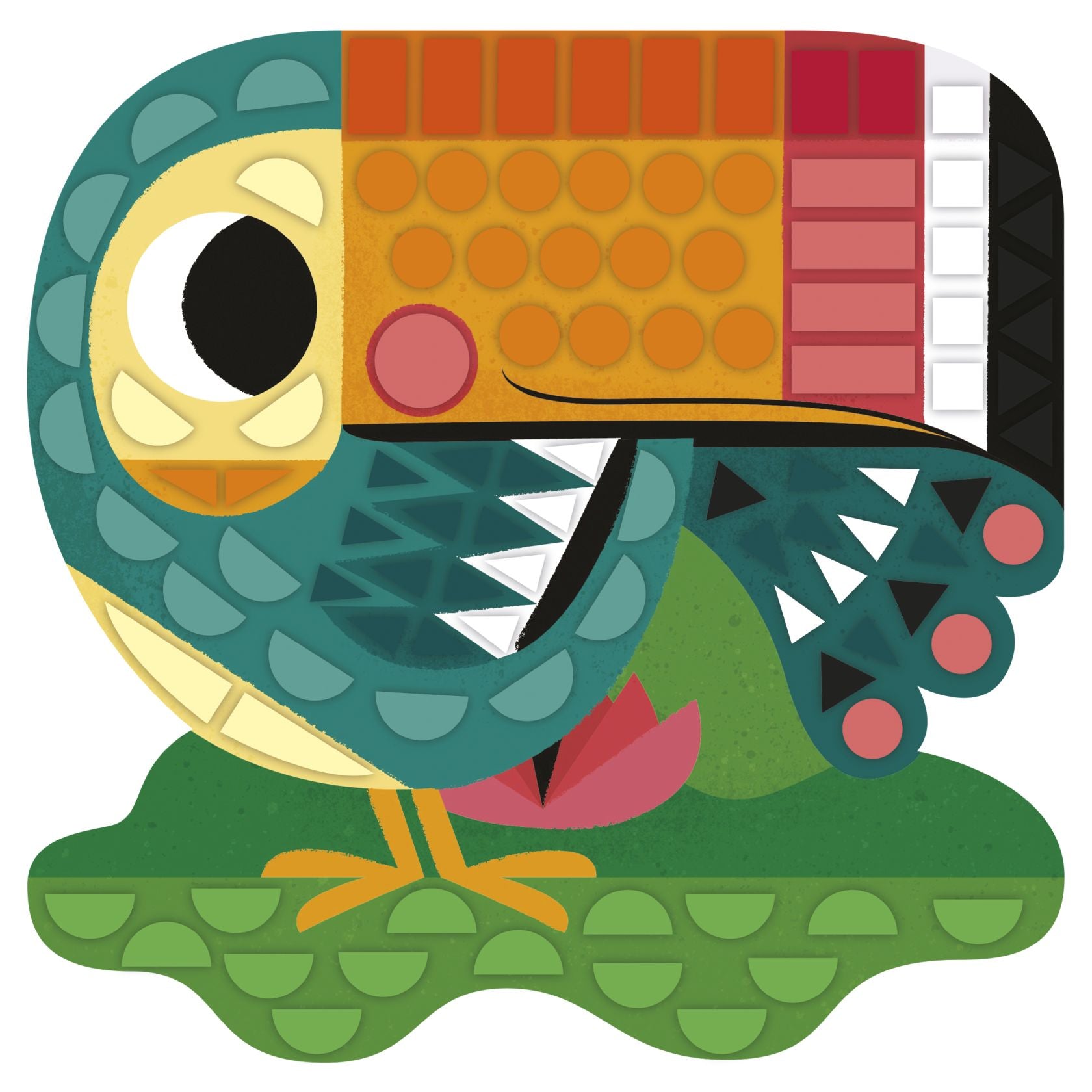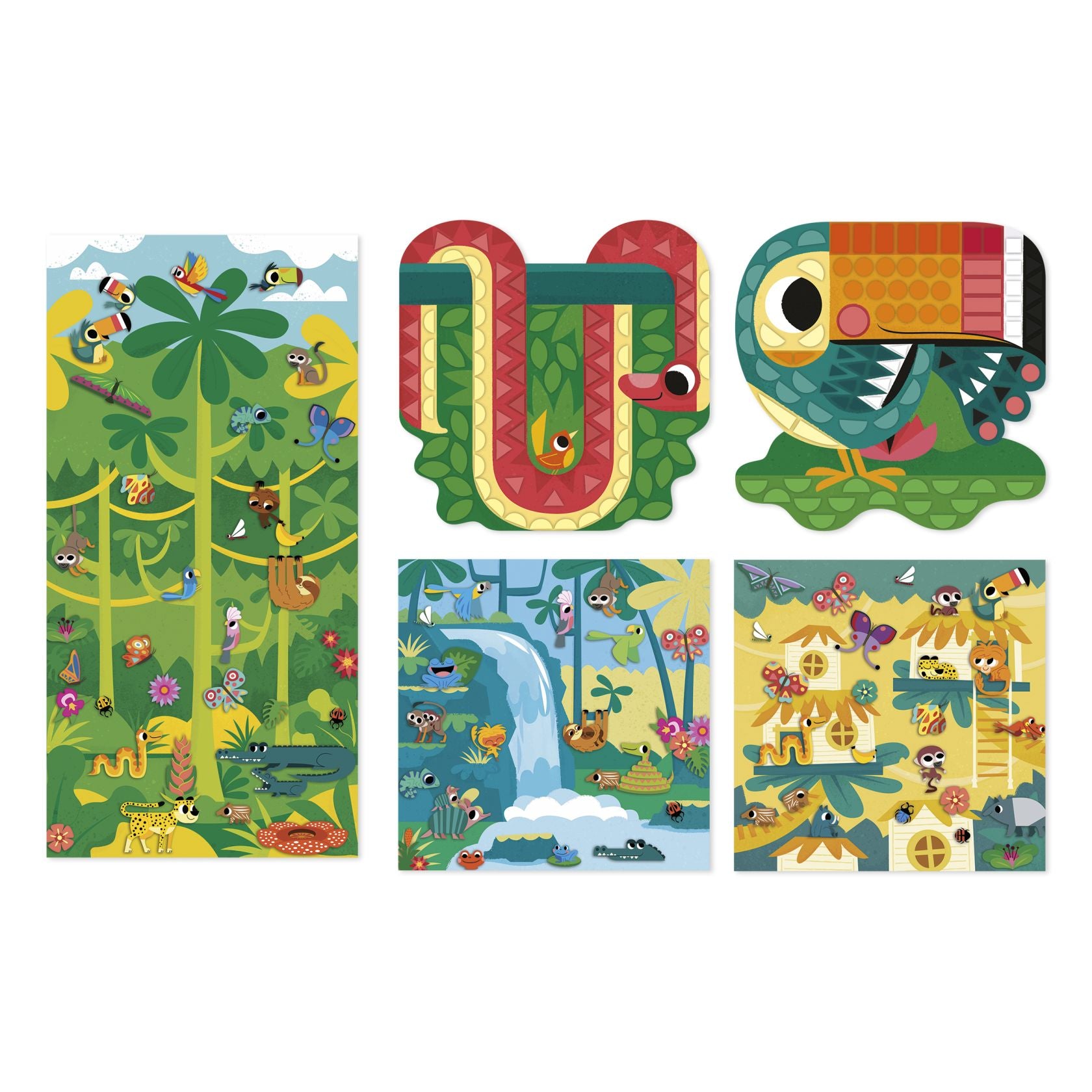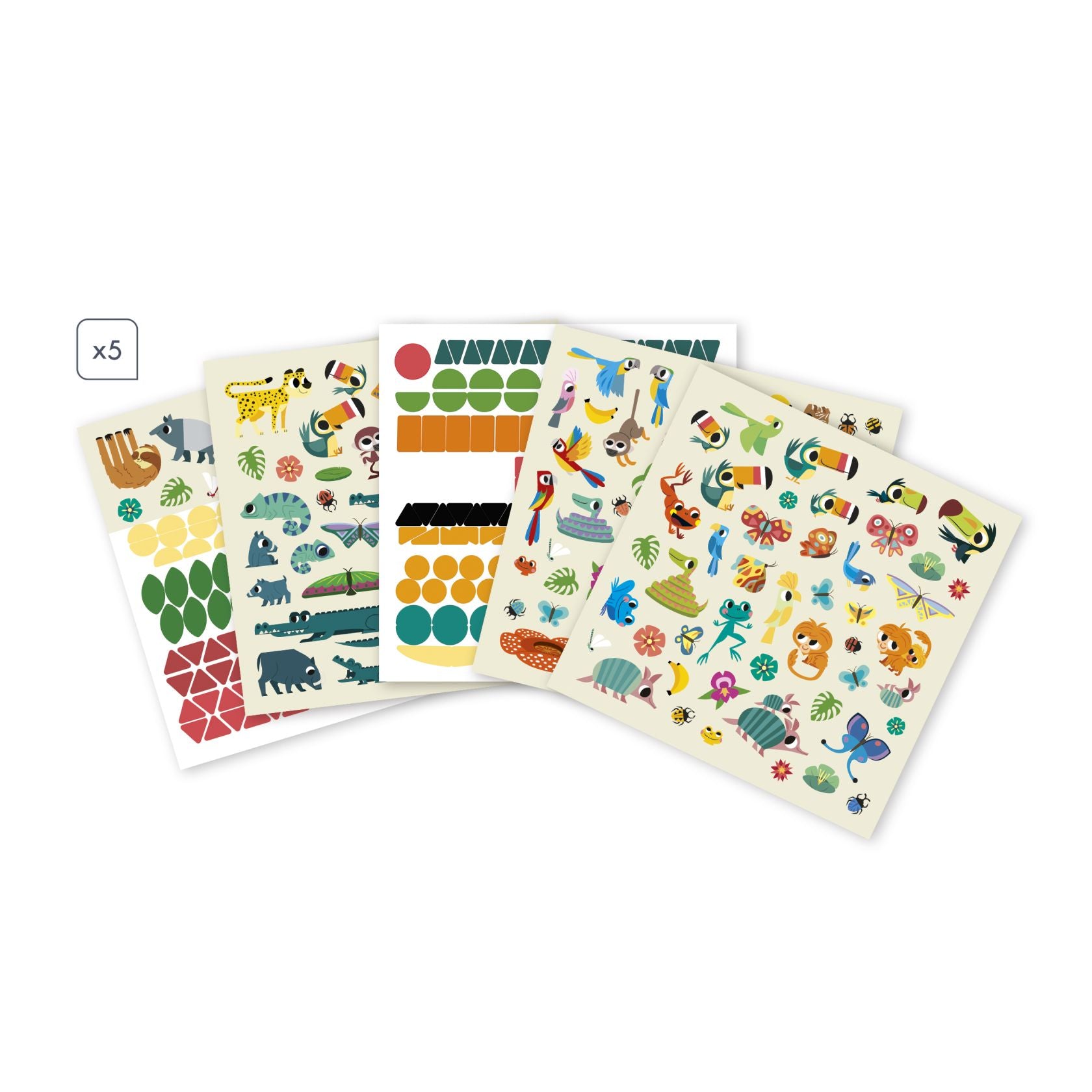 ¡Con este kit creativo tan completo los niños a partir de 5 años se divertirán con unas pegatinas y adornos recién salidos de la jungla! Este estuche sirve para hacer 3 decorados y 2 cuadros con las pegatinas de todos los colores. Solo hay que dejar volar la imaginación para crear unos universos llenos de colores y animales exóticos gracias a las minipegatinas adaptadas a las manitas de los pequeños artistas.