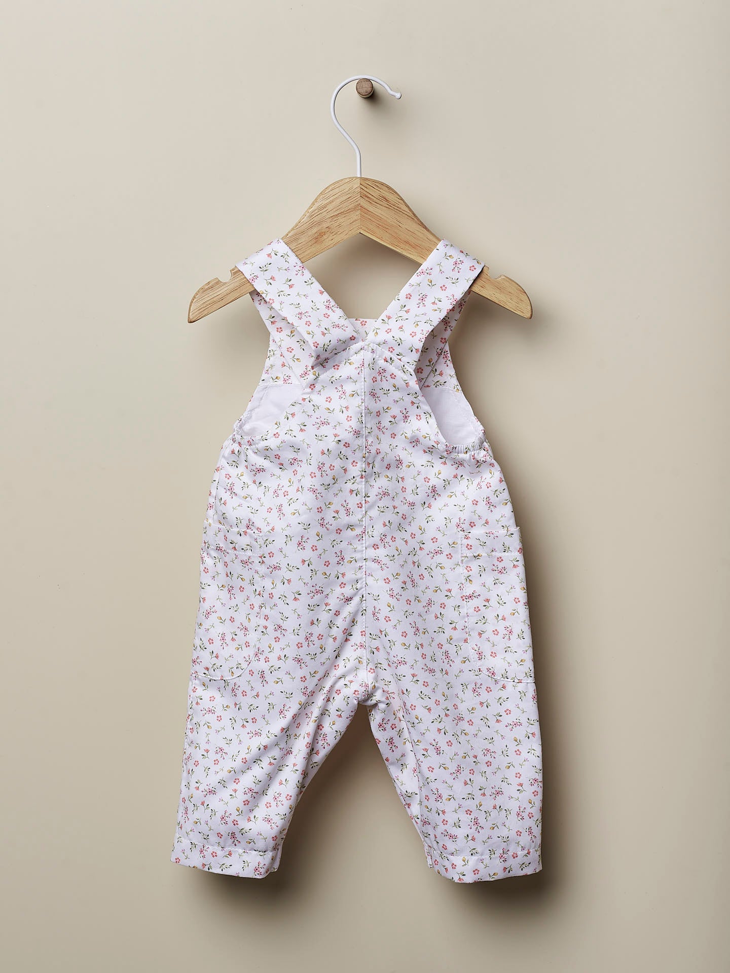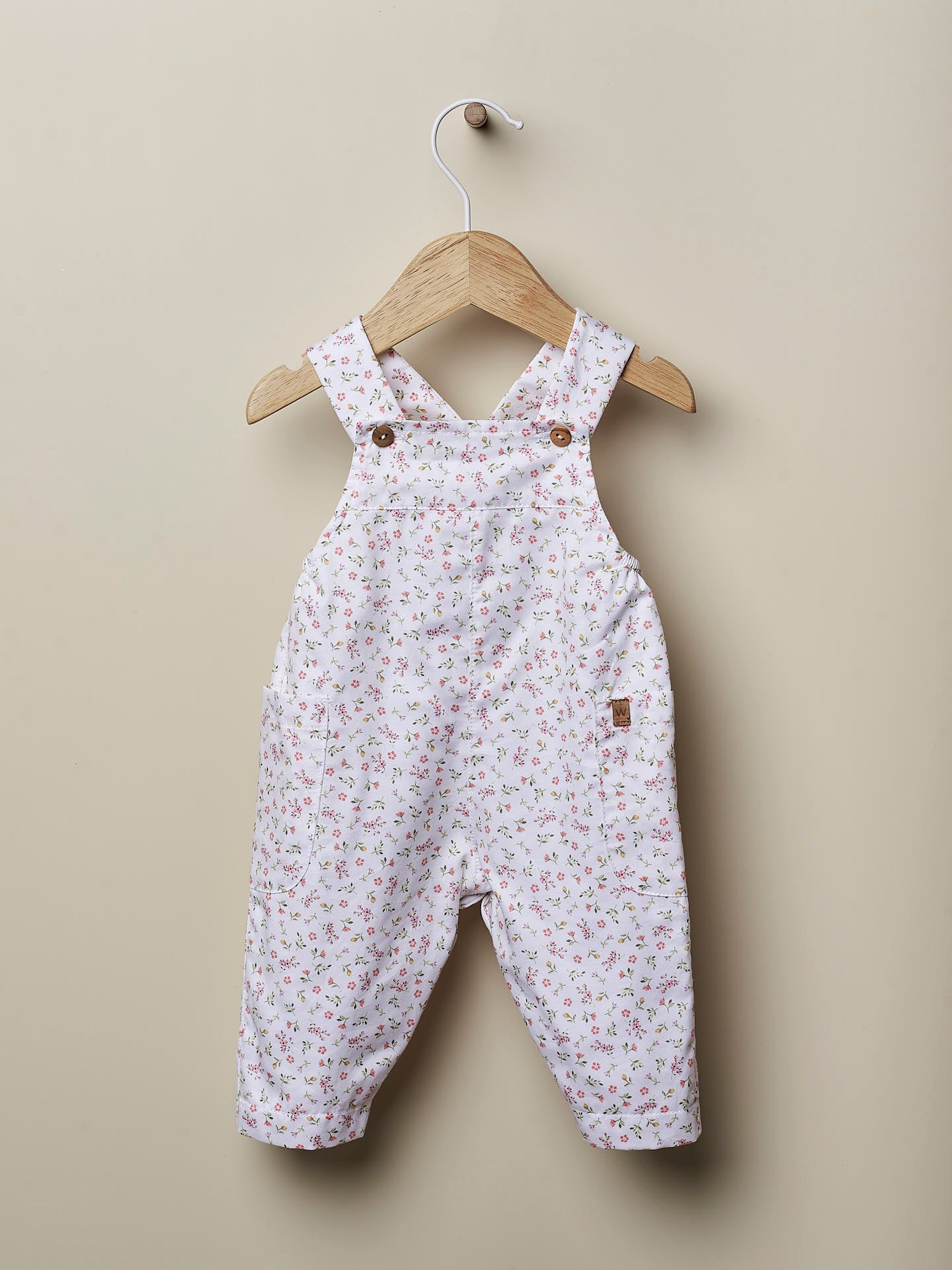 Peto con estampado floral ideal para bebé hasta 4 años. Está confeccionado en algodón ligero con estampado floral sobre fondo perlado. El peto de algodón tiene dos bolsillos laterales y está forrado para mayor comodidad. En las correas hay cierres de botones de madera.