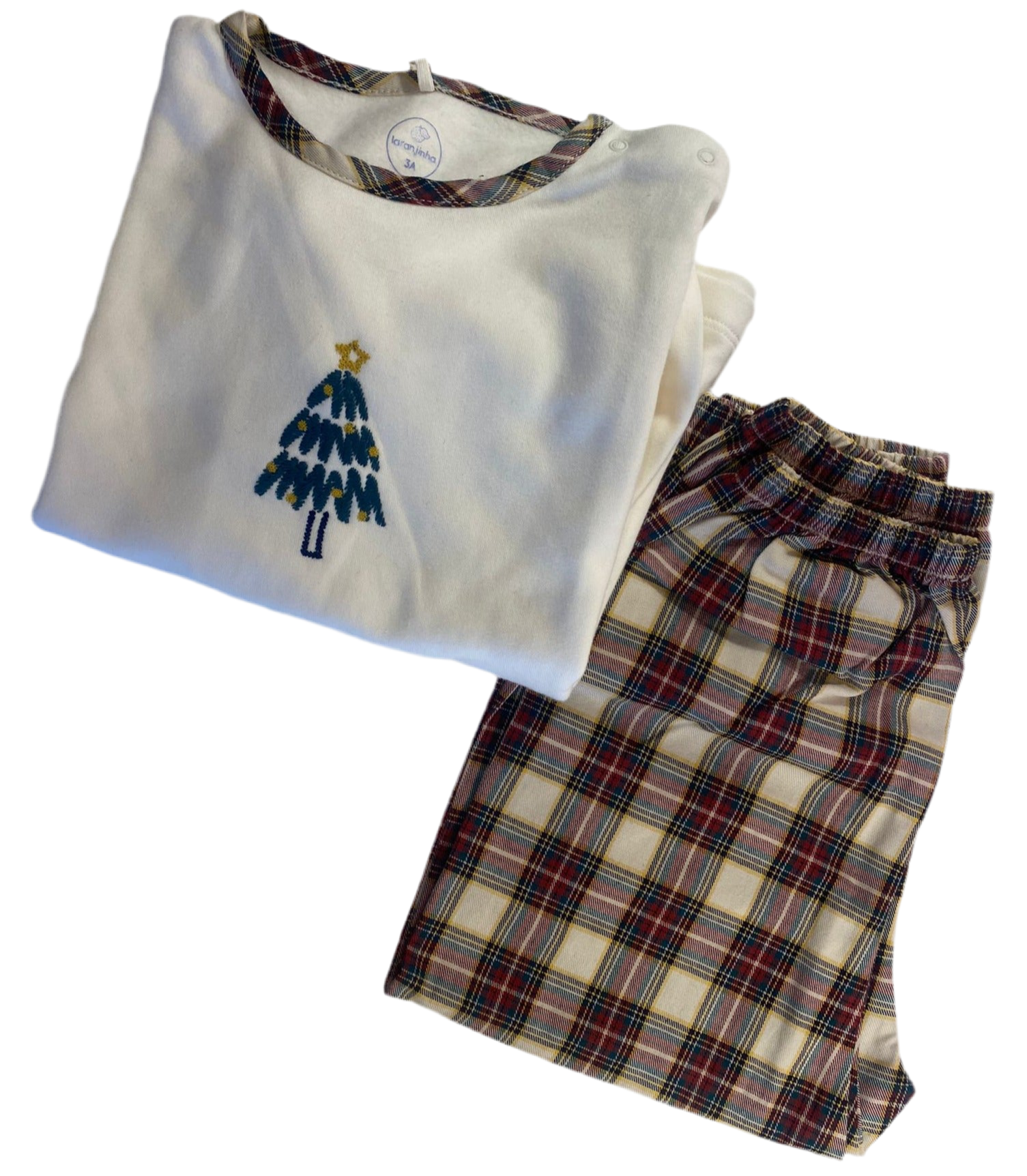 Camiseta de punto 100% algodón cardado con detalle de árbol de navidad bordado en el pecho. Cierra con broches en la espalda. Pantalón en tela de cuadros con cintura elástica para mayor comodidad.