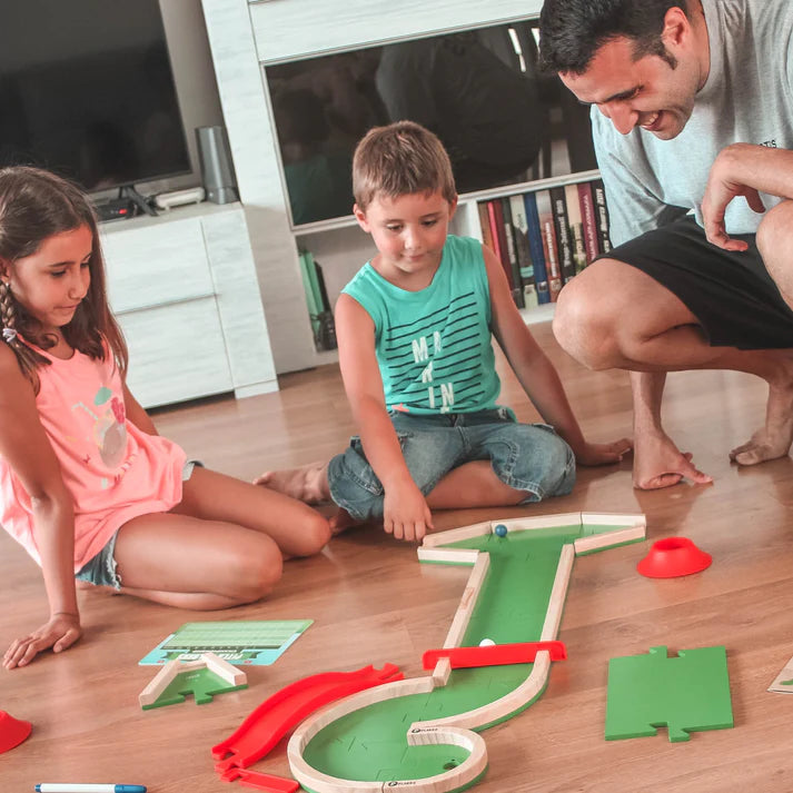 El nuevo juego mesa de Mini Golf hecho de madera y para todas las edades . ¡Construye infinitos circuitos y compite con amigos y familia!