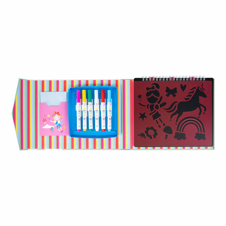 ¡Nuestro brillante cuaderno de pizarra contiene 5 páginas con dibujos listas para colorear y 3 páginas en blanco para hacer garabatos! ¡También hay una hoja de plantilla y otra hoja para calcar extraíble! El cuaderno viene con 6 rotuladores de tiza de colores y un práctico paño para limpiar las páginas una vez hayas terminado.
