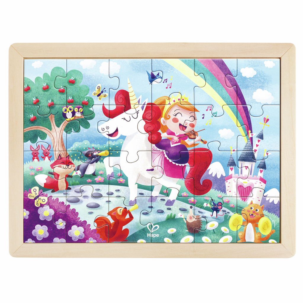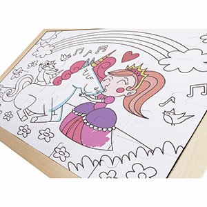 Añade una pizca de polvo de hadas a tu tiempo libre con este mágico puzle. Este precioso puzle de 24 piezas muestra una escena de cuento con arco iris, flores y una princesa. También hay un dibujo en blanco por detrás para que puedas colorear tu propio puzle. Este puzle viene con bandeja de madera y un póster de consulta.