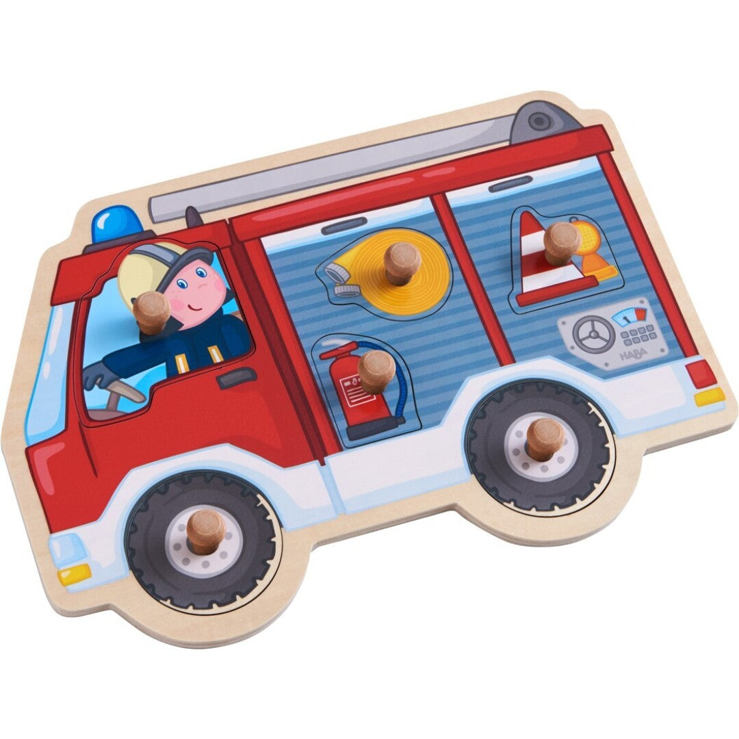 ¡Tito tito!, ¡aquí llegan los bomberos! Con este bonito puzzle de agarrar, los niños pueden descubrir pieza a pieza el coche de bomberos. Extintores, mangueras, señales de aviso: ¡todo tiene su sitio! Las manos de los niños pueden agarrar muy bien las piezas. ¡Así, hacer un puzzle divierte mucho ya sea jugando a solas o en grupo!