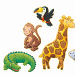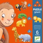 -«Ouistiti et ses amis» es un estuche que incluye 6 puzles gigantes evolutivos de siluetas de 4, 6 y 9 piezas. El niño reconstruye los distintos animales de la selva: loro, mono, león, cocodrilo, jirafa e hipopótamo. Después de montarlos, los superpone para crear una gran pirámide de 1,30 m.