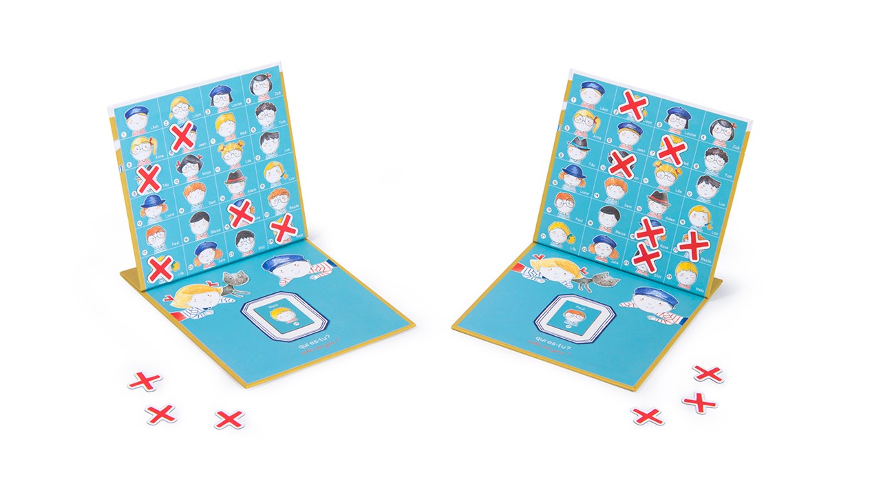Incluye dos tableros magnéticos, 24 fichas de personajes y cruces magnéticas rojas para ir eliminando opciones.