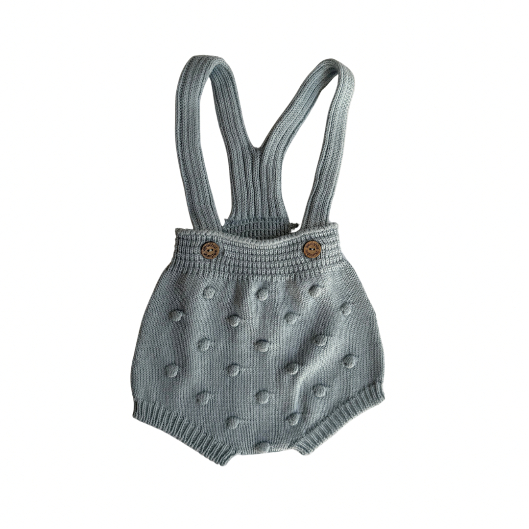 Ranita con tirantes tejido en malla fina de algodón suave y transpirable, ideal para bebés niños y niñas de hasta 24 meses. La ranita se abrocha en la parte delantera en los tirantes y entre las piernas con botones de madera.