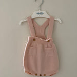 Ranita con tirantes tejido en malla fina de algodón orgánico suave y transpirable, ideal para bebés. Se cierra delante en los tirantes y entre las piernas con botones de madera. Una sola pieza sin costuras, para el máximo confort de tu bebé.