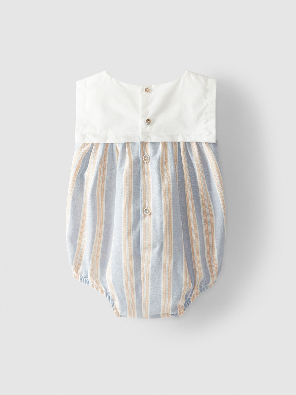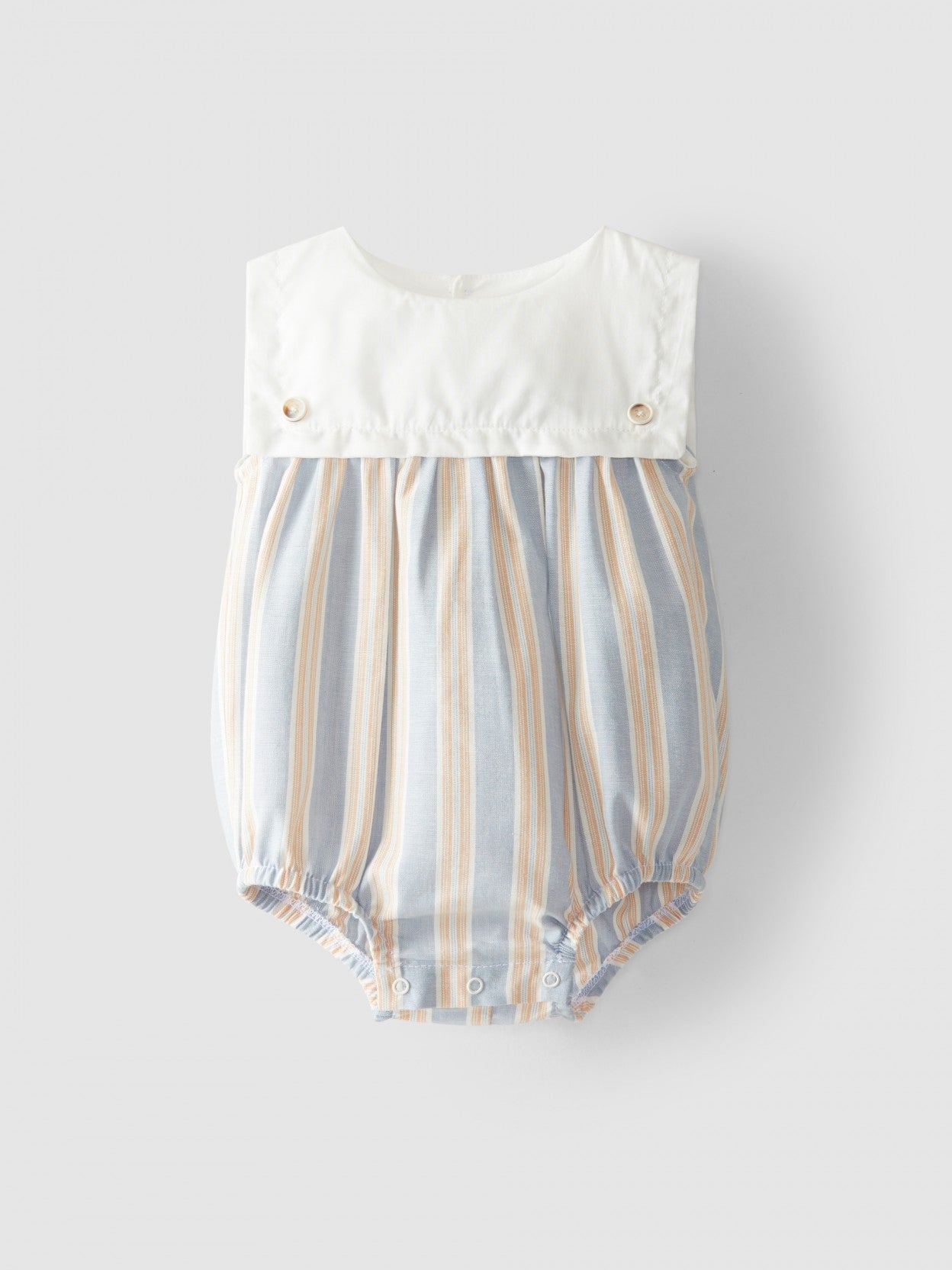 Bombacho en tejido 100% algodón con estampado de rayas. Aplique en el pecho de tejido liso con botones decorativos. Se abrocha en la espalda con botones y broches en la entrepierna.