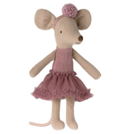 Una ratona hermana mayor vestida como una elegante bailarina. Lleva un hermoso tutú de color jaspeado y una hermosa diadema, lista para horas de baile.