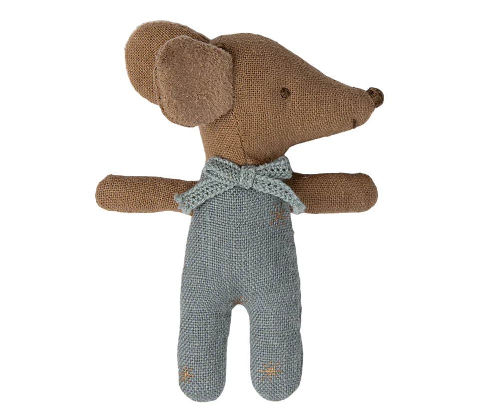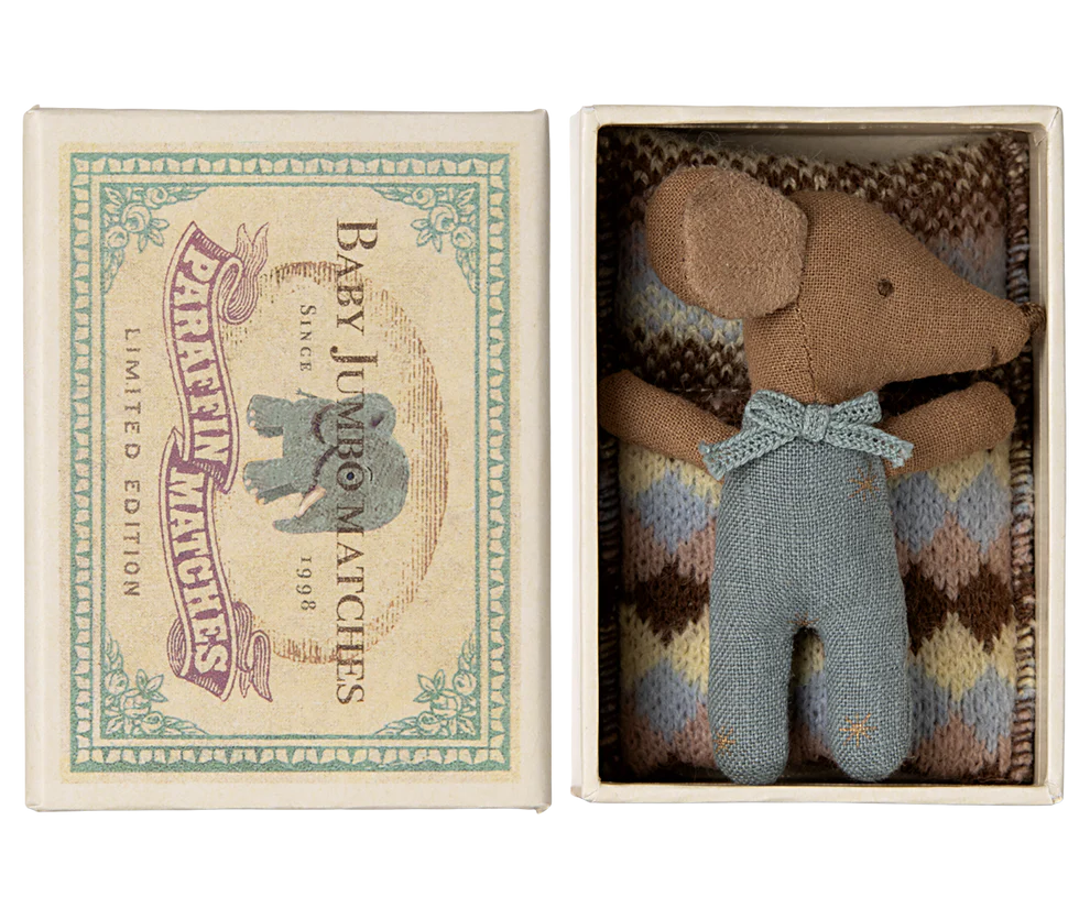 Un artículo clásico de Maileg. Este ratón está listo para jugar durante horas y duerme tranquilo en su pequeña caja de cerillas. La ropa y la ropa de cama están confeccionadas con tejidos suaves con estampados únicos en bonitos colores.