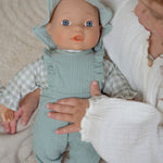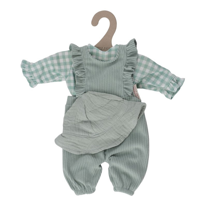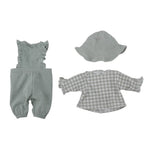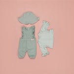 ¿Qué vestirá tu muñeca hoy? Este encantador conjunto es perfecto para cualquier ocasión. Disfruta vistiendo a tu muñeca favorita para un día lleno de aventuras y juegos. El conjunto presenta un mono con volantes en un tono verde suave unido a un cuerpo de manga larga con el diseño Fresh Green Check. Para completar este encantador conjunto, el juego incluye un lindo sombrero para el sol de color verde suave.
