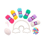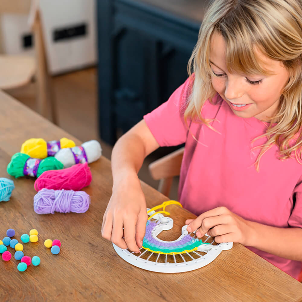 Contiene: 1 arcoíris de madera FS lacada en blanco con agujeros troquelados. Ovillos de lana de los colores del arcoíris (10g cada uno) rosa, violeta, azul, verde y amarilla. Lana de color blanco (5 g) para las nubes, 1 rollo de hilo de coser blanco, 25 pompones de 5 colores, 1 aguja de plástico, 1 aguja de coser de metal e instrucciones ilustradas paso a paso.