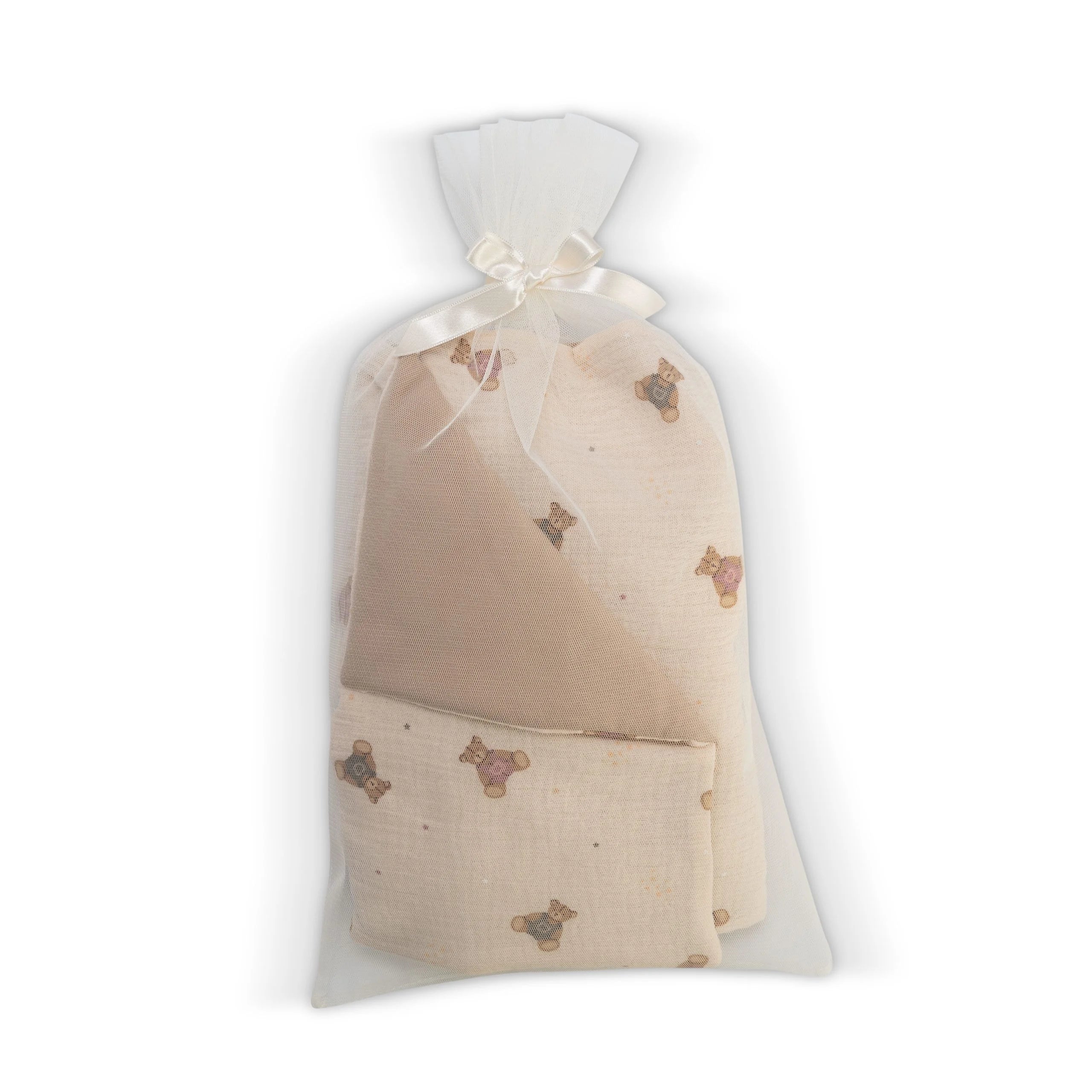 Bolsa de tul con lazo de raso beige. Con nuestro Set de Edredón y Almohada para Cunas, Literas y Capazos, tus muñecos estarán siempre cómodos y bien vestidos. ¡Compra ahora y deja que la diversión y el cuidado imaginativo se mezclen perfectamente en el mundo de tus pequeñas!