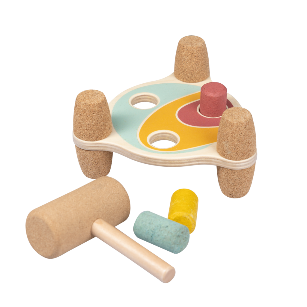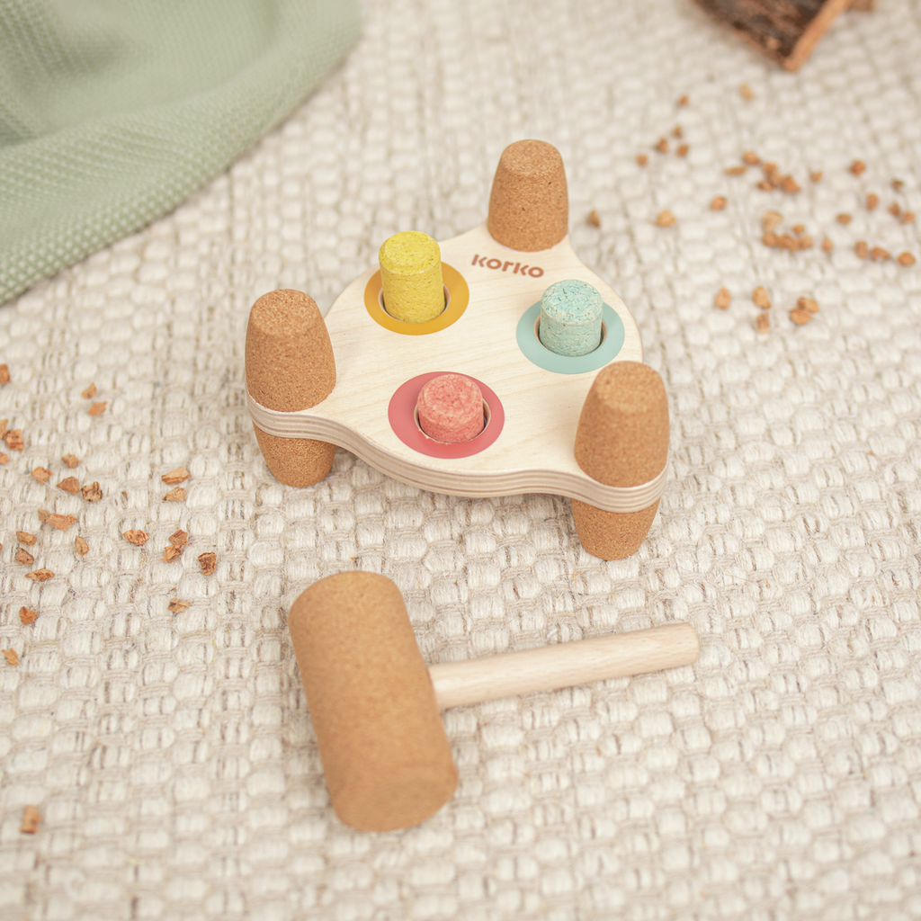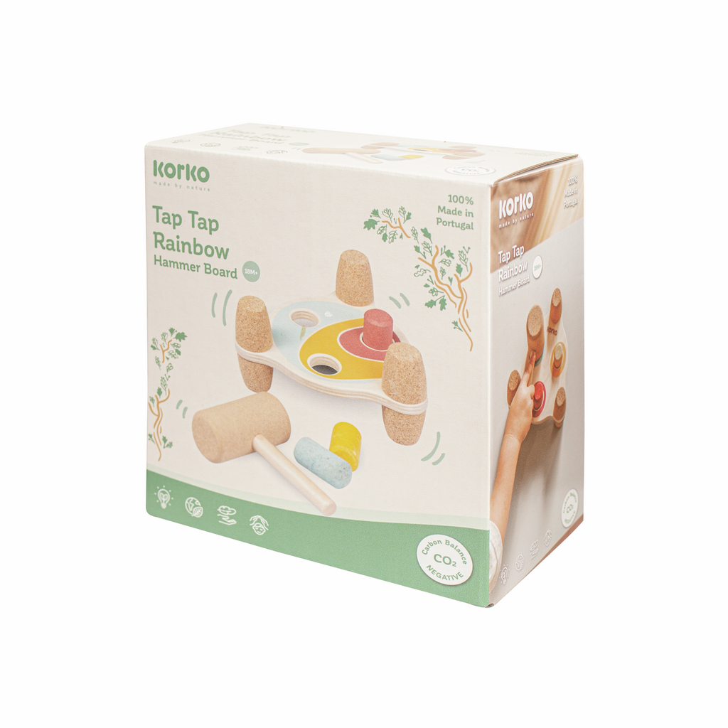 El Mazo Arcoíris es un juguete único que mejora las habilidades motoras y la coordinación ojo-mano de los niños y niñas. El martillo y los accesorios están hechos de corcho suave y ecológico, un material natural y sostenible conocido por su textura suave y durabilidad. Los pies de la tabla también están hechos de corcho para proporcionar una superficie antideslizante y estable. El corcho es seguro y suave para que los niños y las niñas lo toquen, jueguen y sostengan, mientras que el tablero de martillo también puede ayudar a desarrollar la creatividad y la imaginación de los niños, ya que sus colores brillantes inspiran las mentes de sus hijos e hijas.