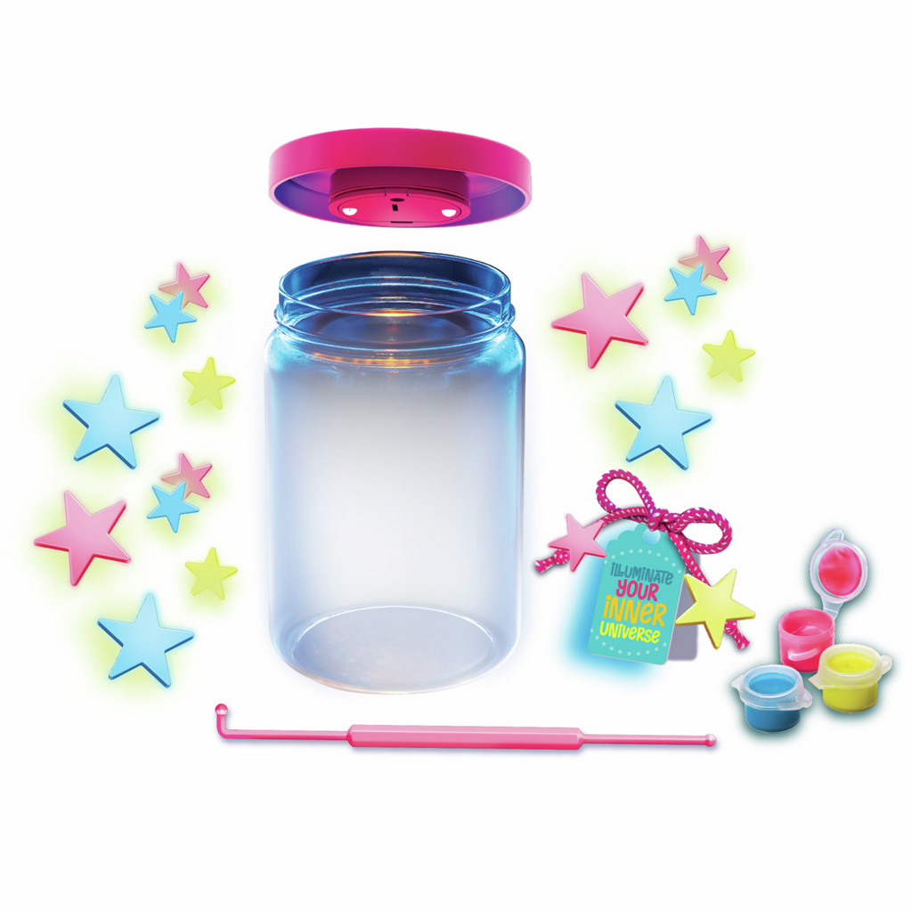 El Set de Manualidades incluye un frasco de plástico resistente, una cubierta para luz LED y pilas botón para iluminación inmediata. Con tres pinturas de tela neón vibrantes, los niños pueden crear diseños únicos en el frasco. Una herramienta de pintura especial de doble punta permite realizar patrones intrincados, especialmente en el fondo. Aproximadamente 20 estrellas que brillan en la oscuridad añaden un efecto mágico y estrellado, y el frasco se transforma en una varita luminosa al agregar las estrellas.