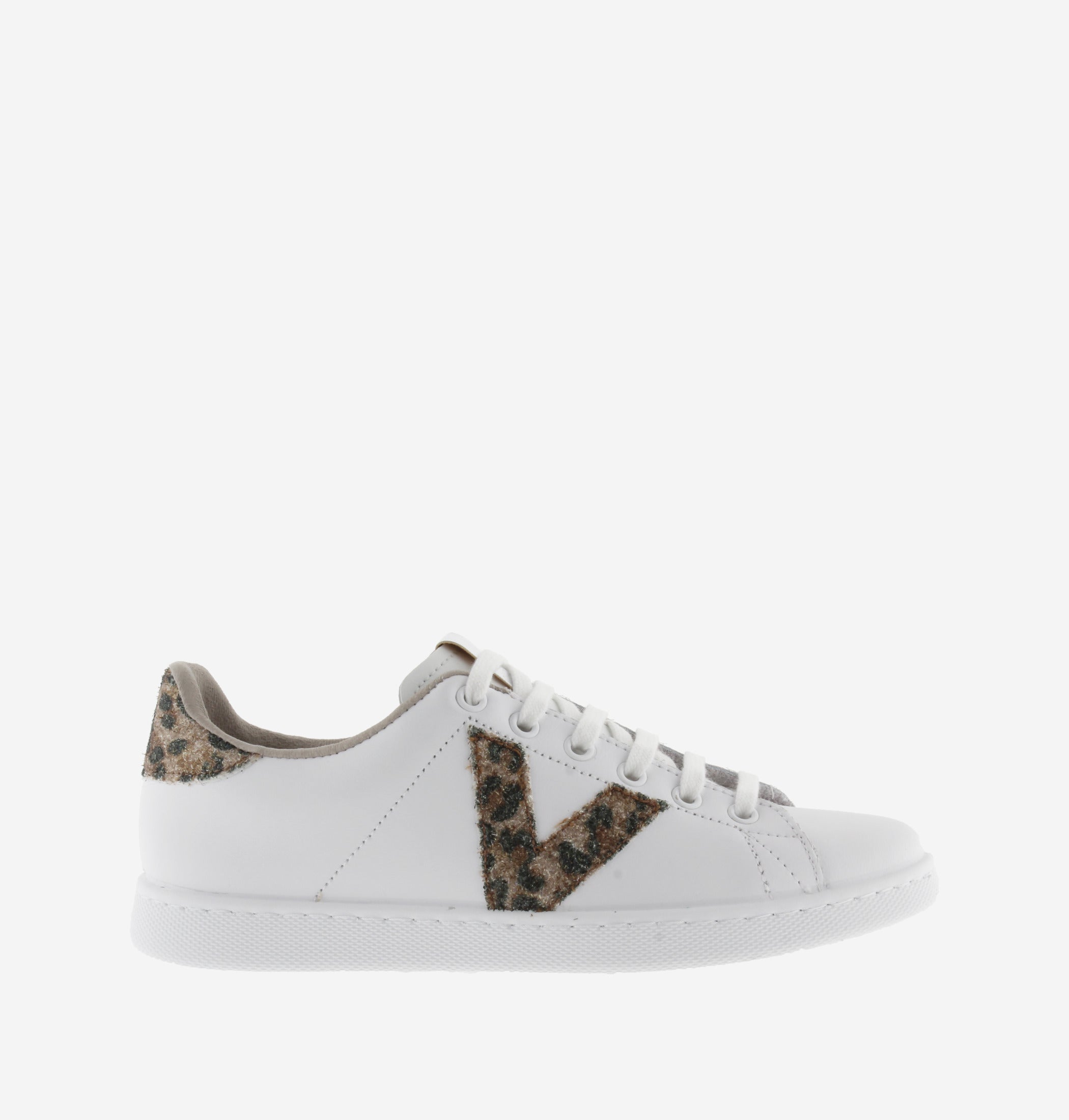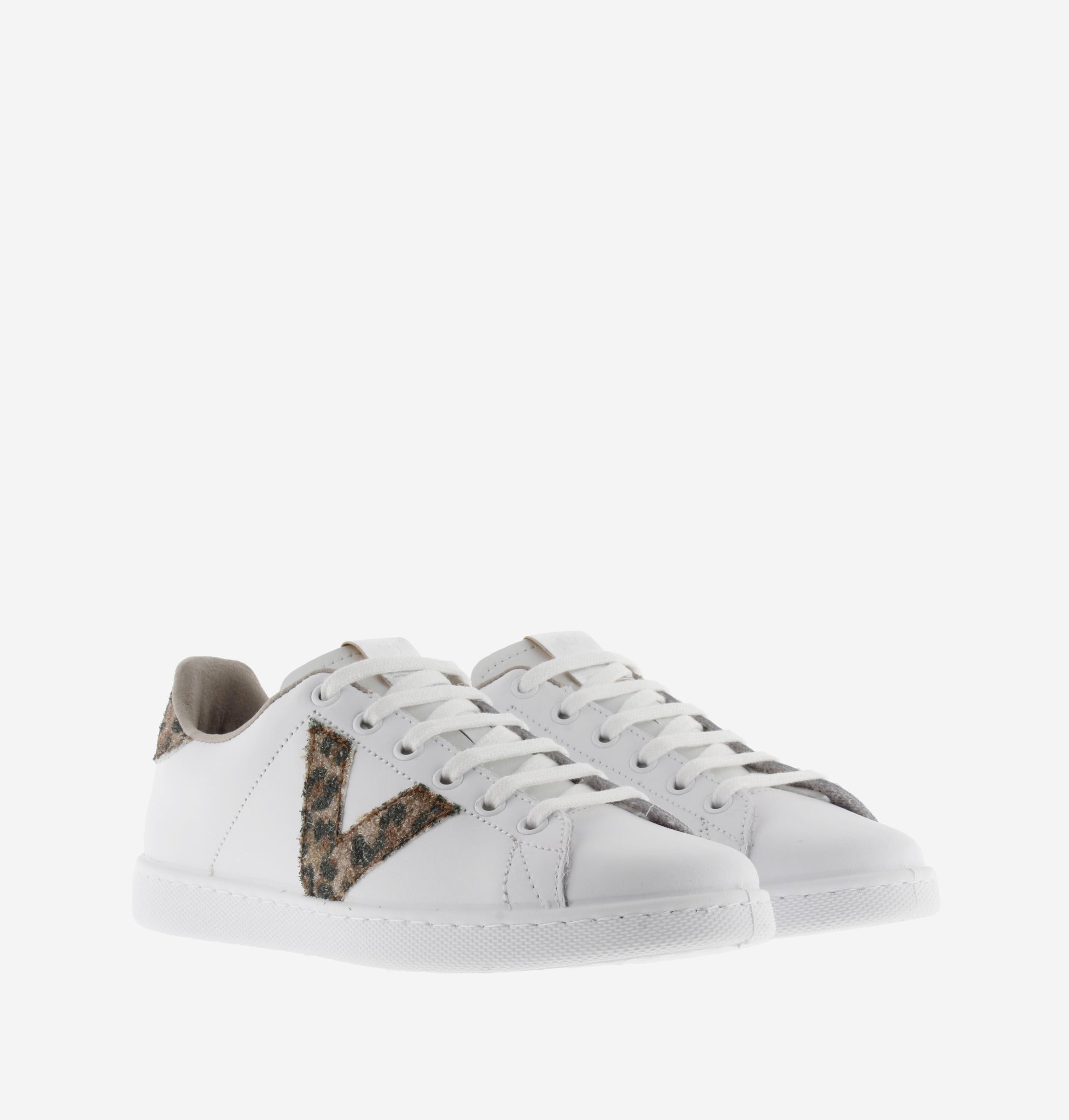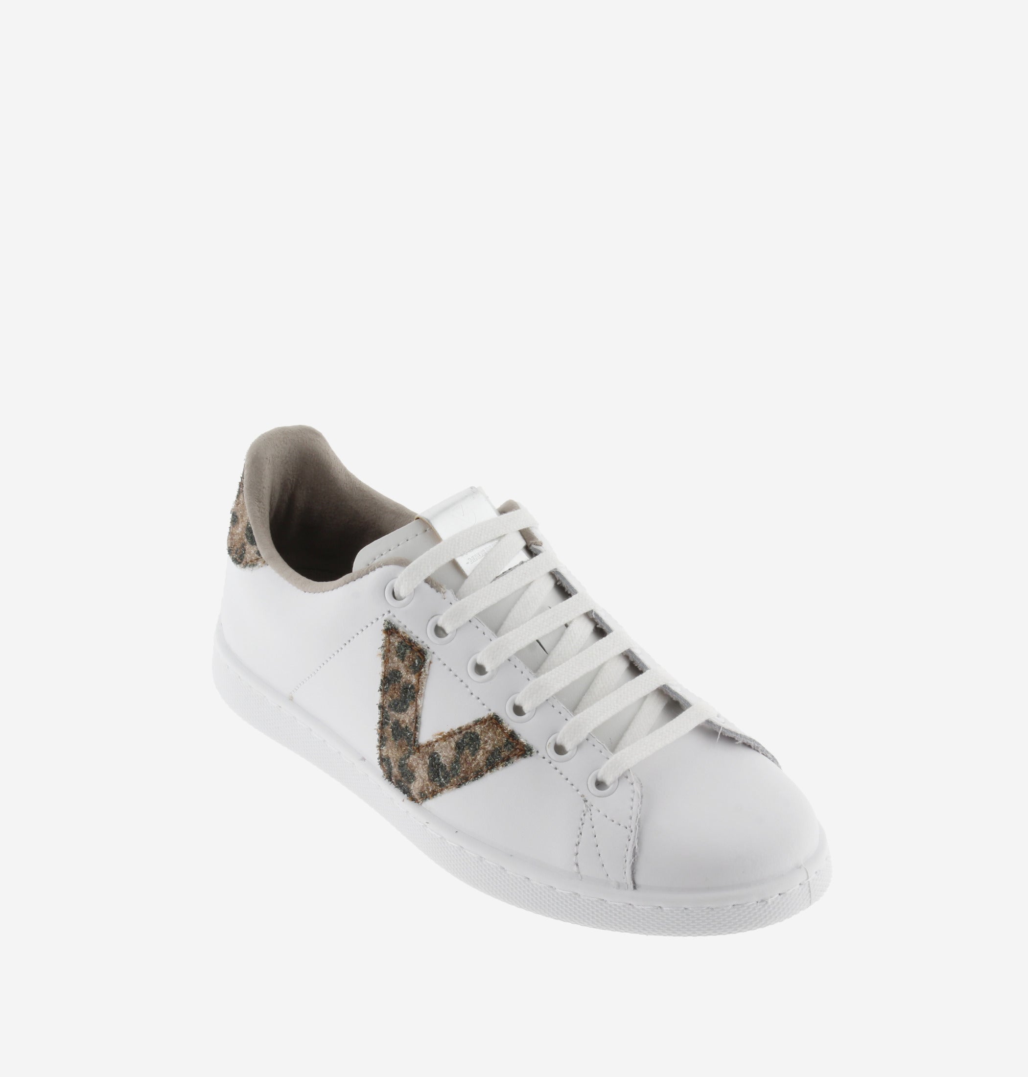 Zapatillas de piel blanca (certificado LWG) con el logotipo de victoria lateral y la pieza trasera en colores en glitter. Cómoda suela de PVC a base de aceites vegetales. Made in Spain.
