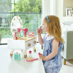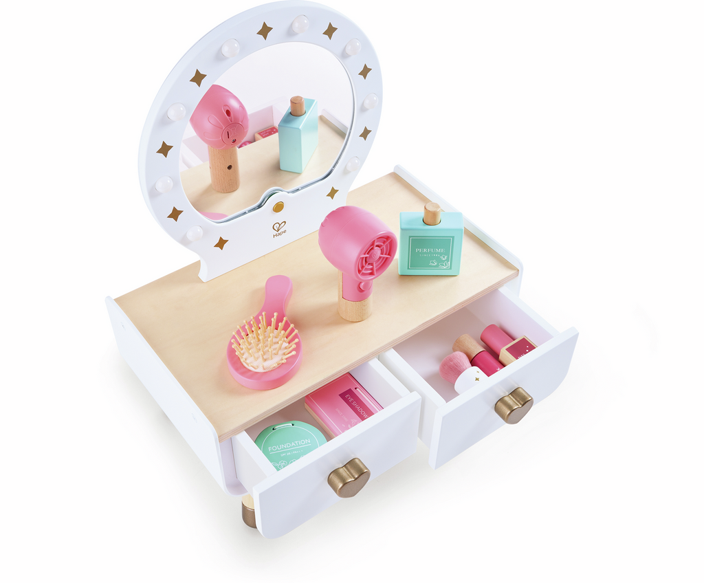 Introduce el mundo de la belleza a través del Tocador Infantil. Este atractivo set fomenta la creatividad y la motricidad fina mientras los niños se sumergen en el arte del maquillaje, promoviendo el autodescubrimiento y la confianza mediante rutinas de autocuidado con el elegante tocador, que incluye un espejo y luces que funcionan.