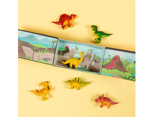 ¡Ahora puedes llevar tus dinosaurios a todas partes! Crea tu propia aventura prehistórica con seis de tus minidinosaurios favoritos, incluidos T-Rex, Stegosaurus, Triceratops, Dimetrodon, Apatosaurus y el increíble Parasaurolophus.