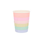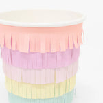 Los vasos están cubiertos con flecos en capas en coral neón, rosa, rosa pálido, amarillo, menta y azul.