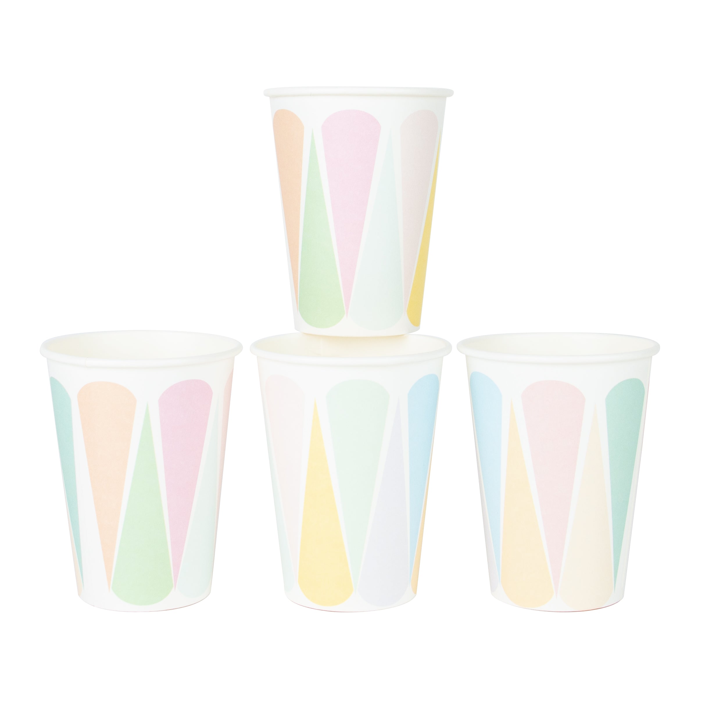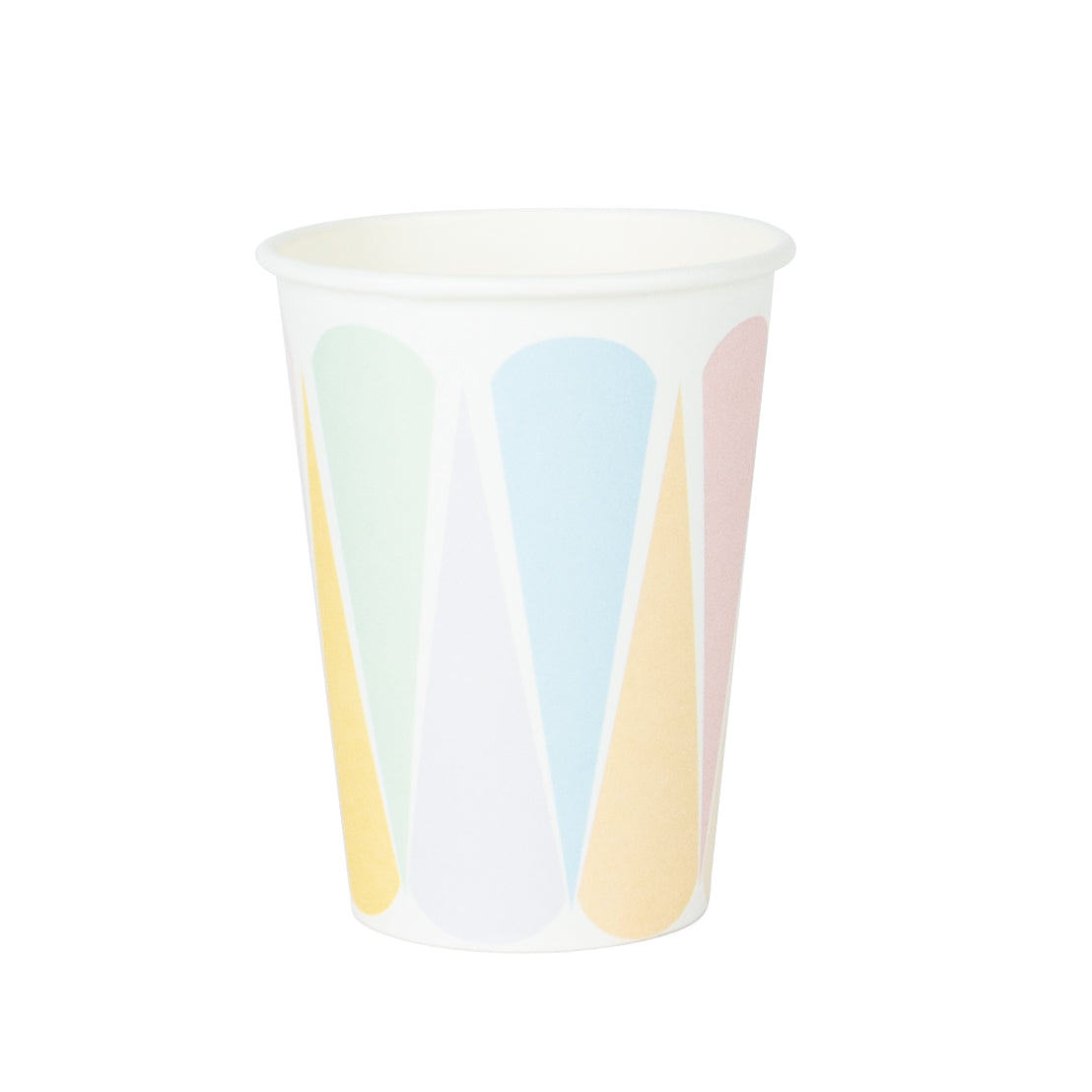 Set de 8 vasos de papel con un original estampado de colores pastel. ¡Ideal para montar una fiesta preciosa! Dale un toque único y especial a tus fiestas.