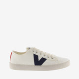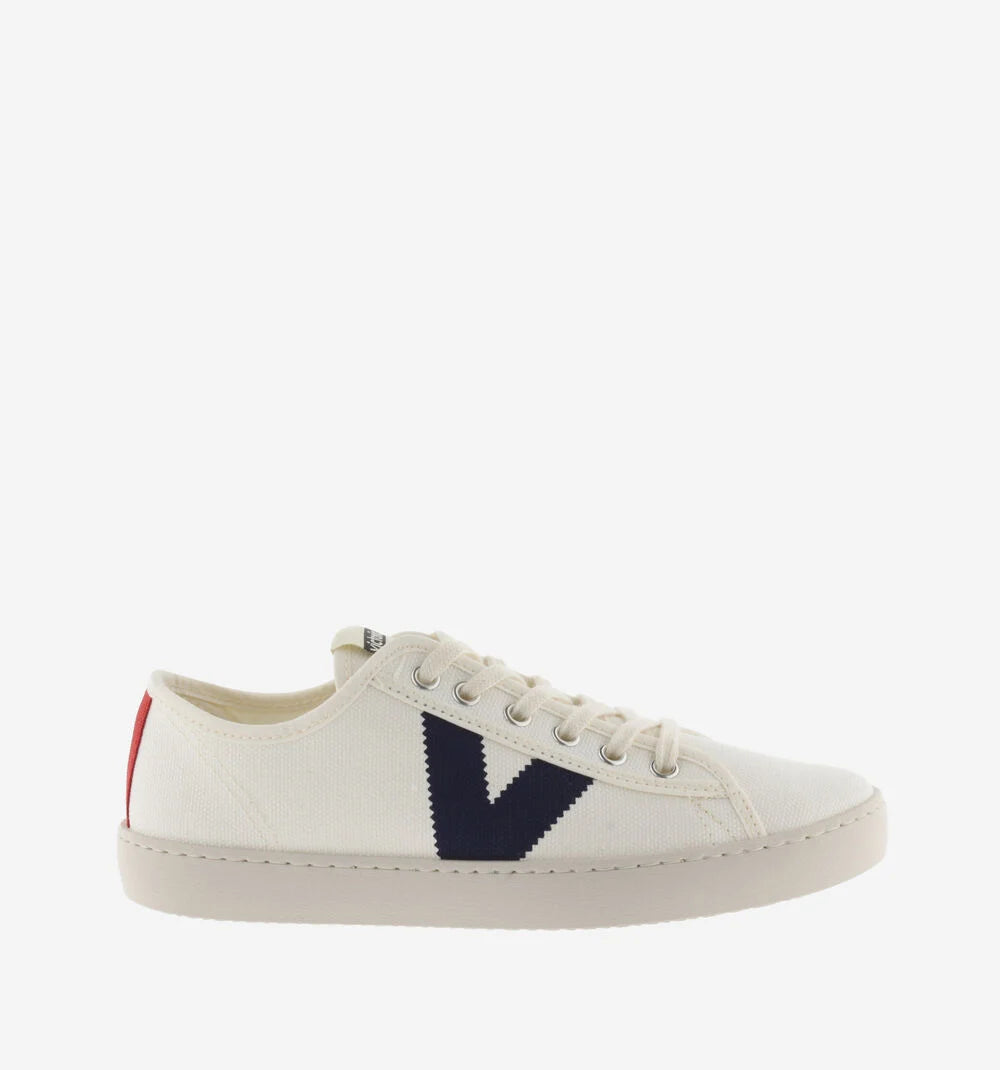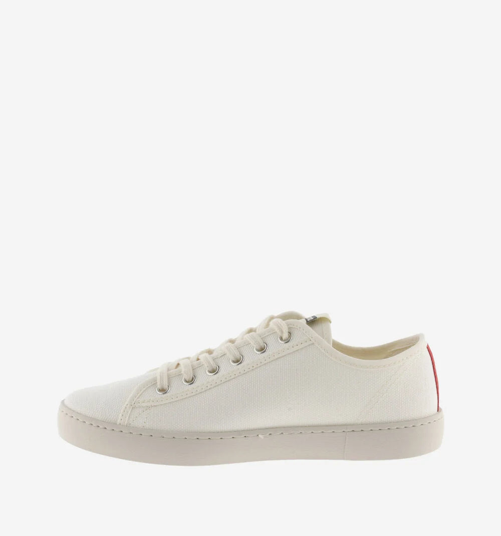 Zapatillas blancas unisex de lona gruesa con algodón 100% ecológico cultivado, hilado y tejido en España. Print del logo en el lateral y tira de color en la trasera. Llevan una plantilla más ergonómica confeccionada a partir de materiales reciclados y su suela está elaborada con aceites vegetales en lugar de minerales para reducir el impacto medioambiental.