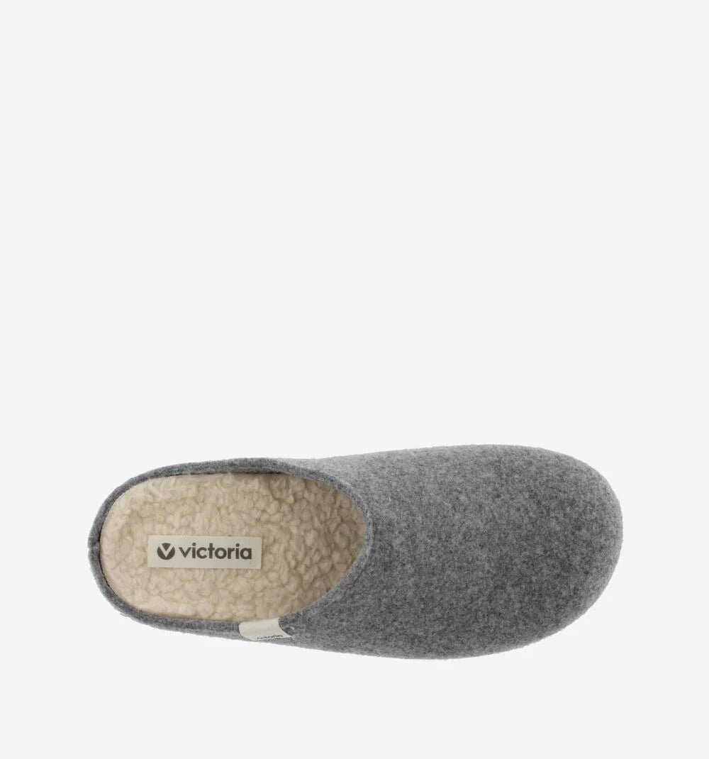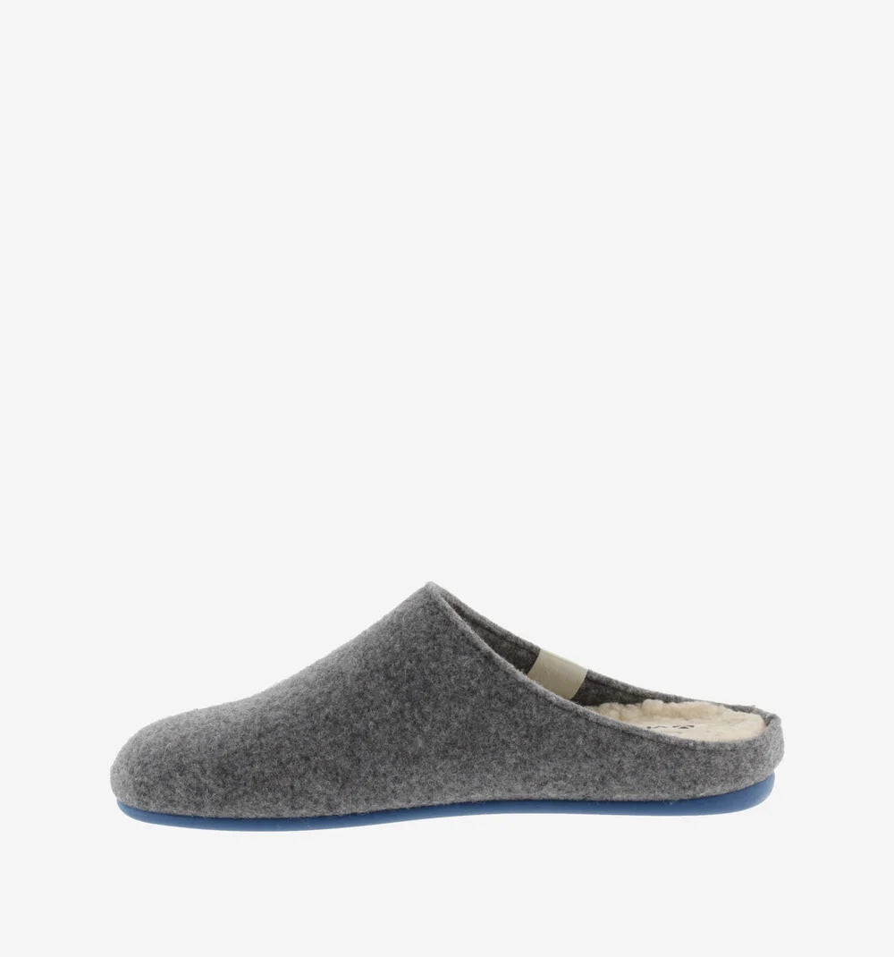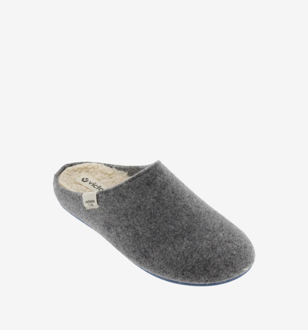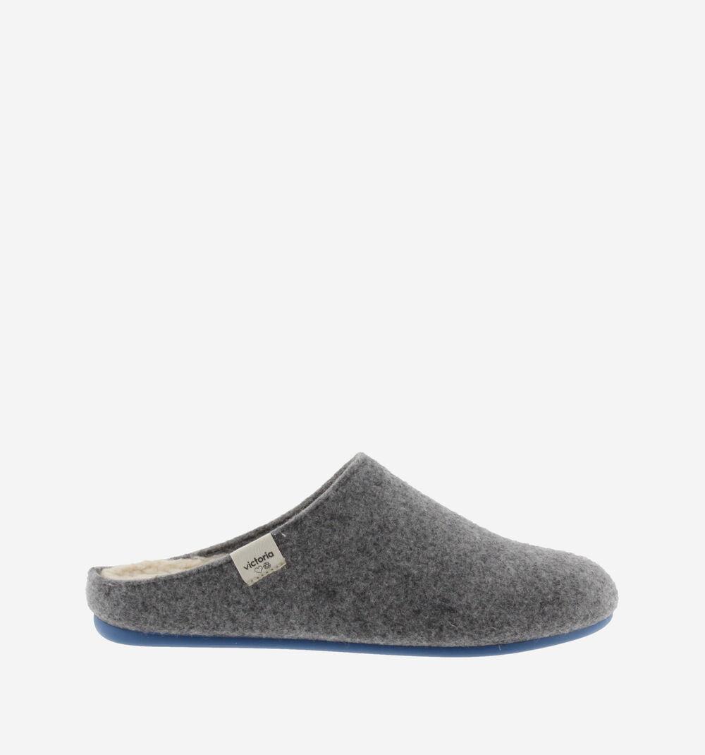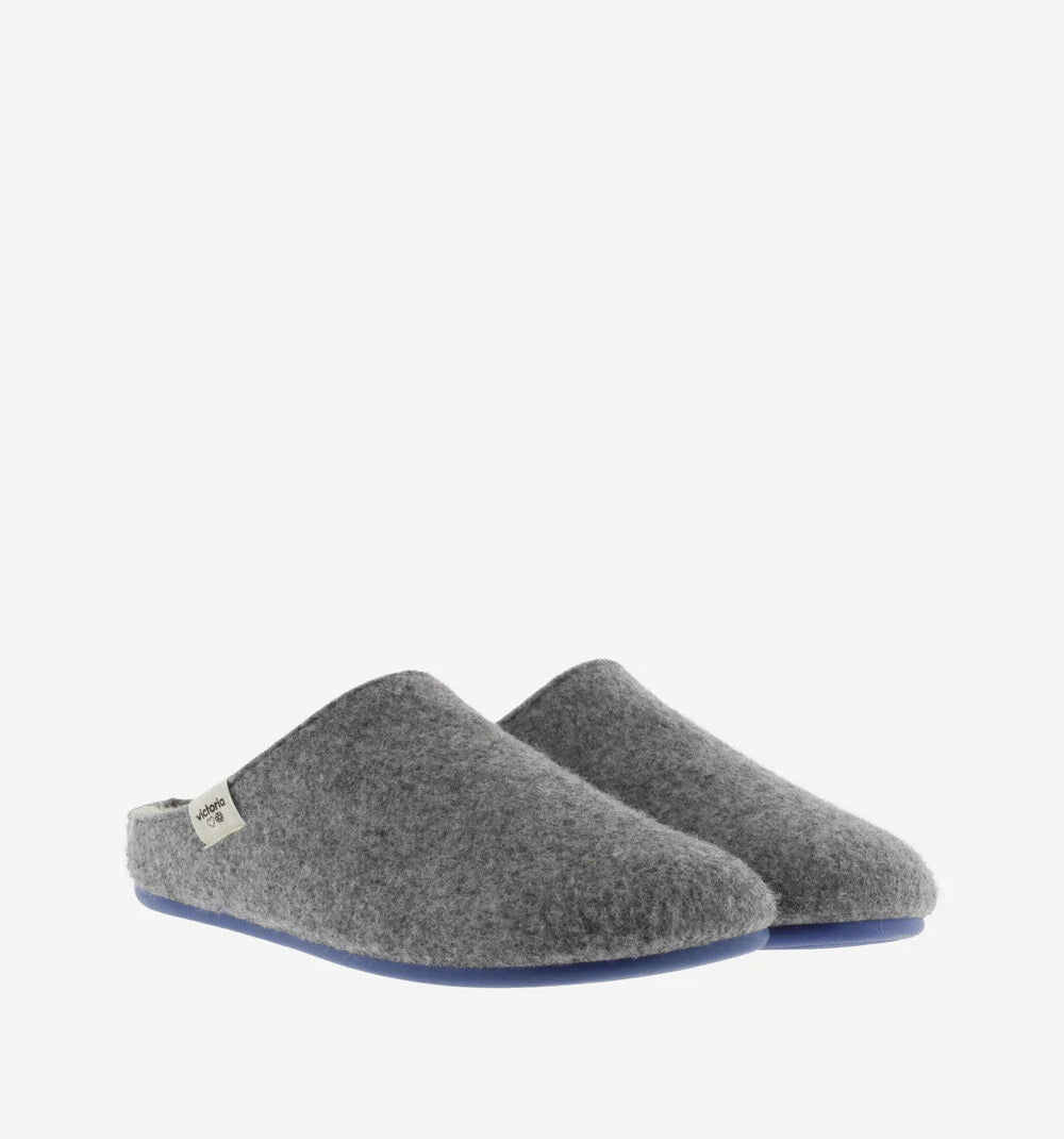 Zapatillas de casa grises para mujer y hombre destalonadas. Fabricadas en España en fieltro a partir de PET reciclado. Cómoda suela de caucho natural 100%. Incluyen plantilla extraíble de tejido tipo borreguito que aporta calidez y confort.