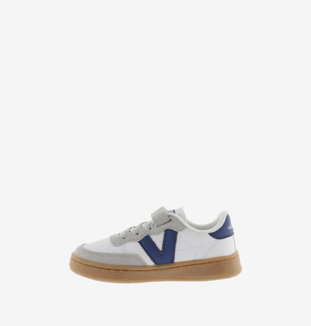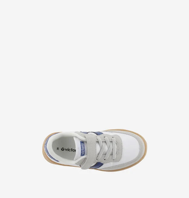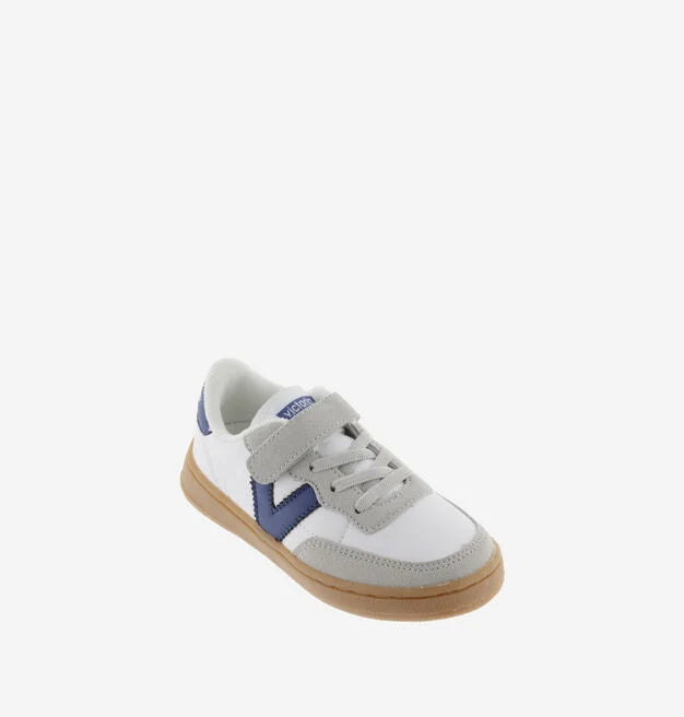 Zapatillas deportivas blancas para niños fabricadas en material efecto piel y piezas de efecto serraje, para un estilo duradero y moderno. Detalle de color en la V del lateral y en la pieza trasera. Cierre mediante cordones elásticos y una tira adhesiva para un ajuste cómodo y fácil de poner. La suela en color caramelo añade un toque único completando el diseño juvenil y versátil de estas zapatillas.