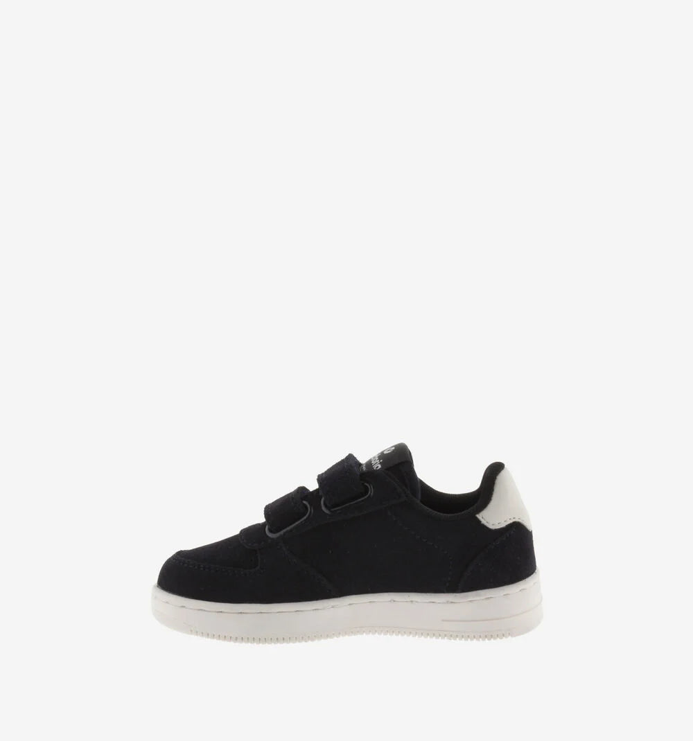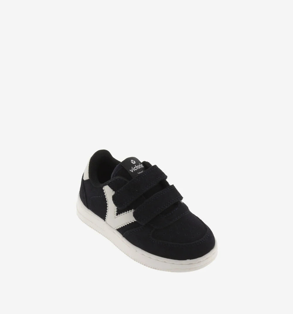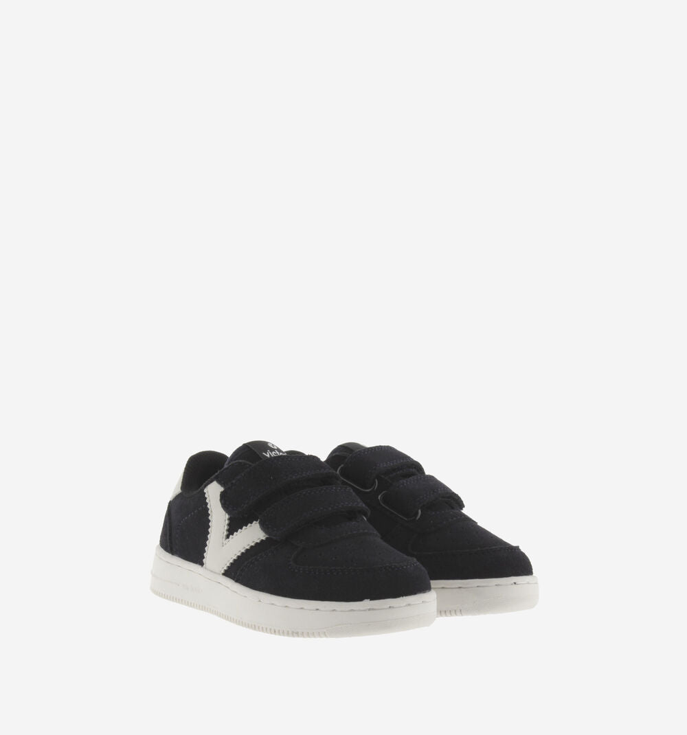 Zapatillas marino para niño fabricadas en serraje. Logo en el lateral y detalle en la trasera en material efecto piel color blanco. Cierre mediante tiras adherentes que facilitan el calce y hace que se ajusten perfectamente al pie. Lleva un perforado en el empeine para favorecer la transpiración. A partir de la talla 36 incluye tres tiras para una mejor sujeción.