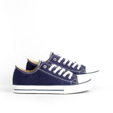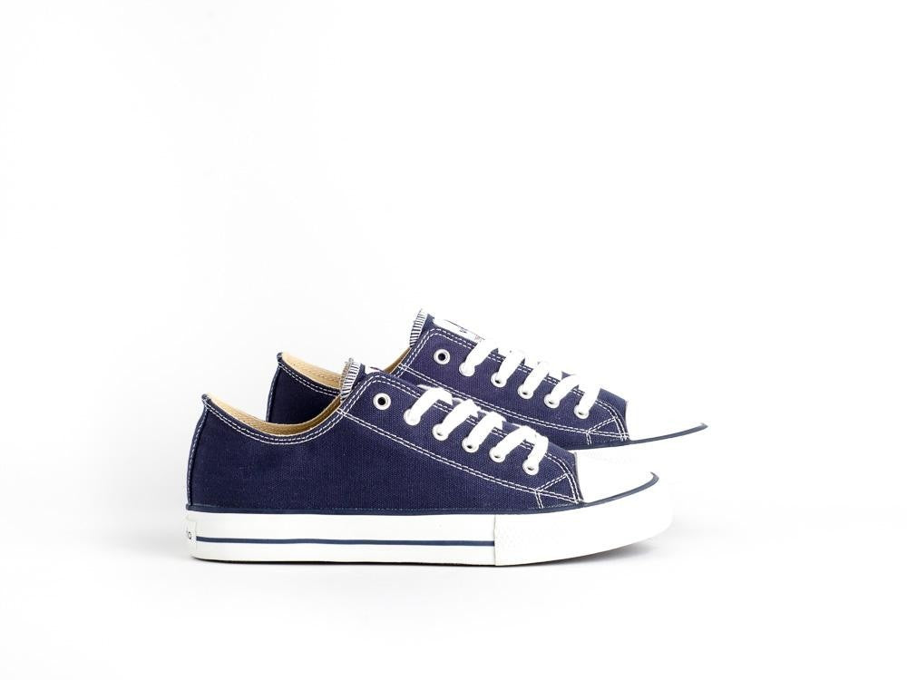 Zapatillas de lona azul marino con cordones ligeras y atemporales. Cierre mediante cordones en blanco y etiqueta en la lengüeta. Suela de 2,5 cm y refuerzo en la puntera que las hace más resistentes y duraderas. Llevan plantilla de alta densidad para un mayor confort.