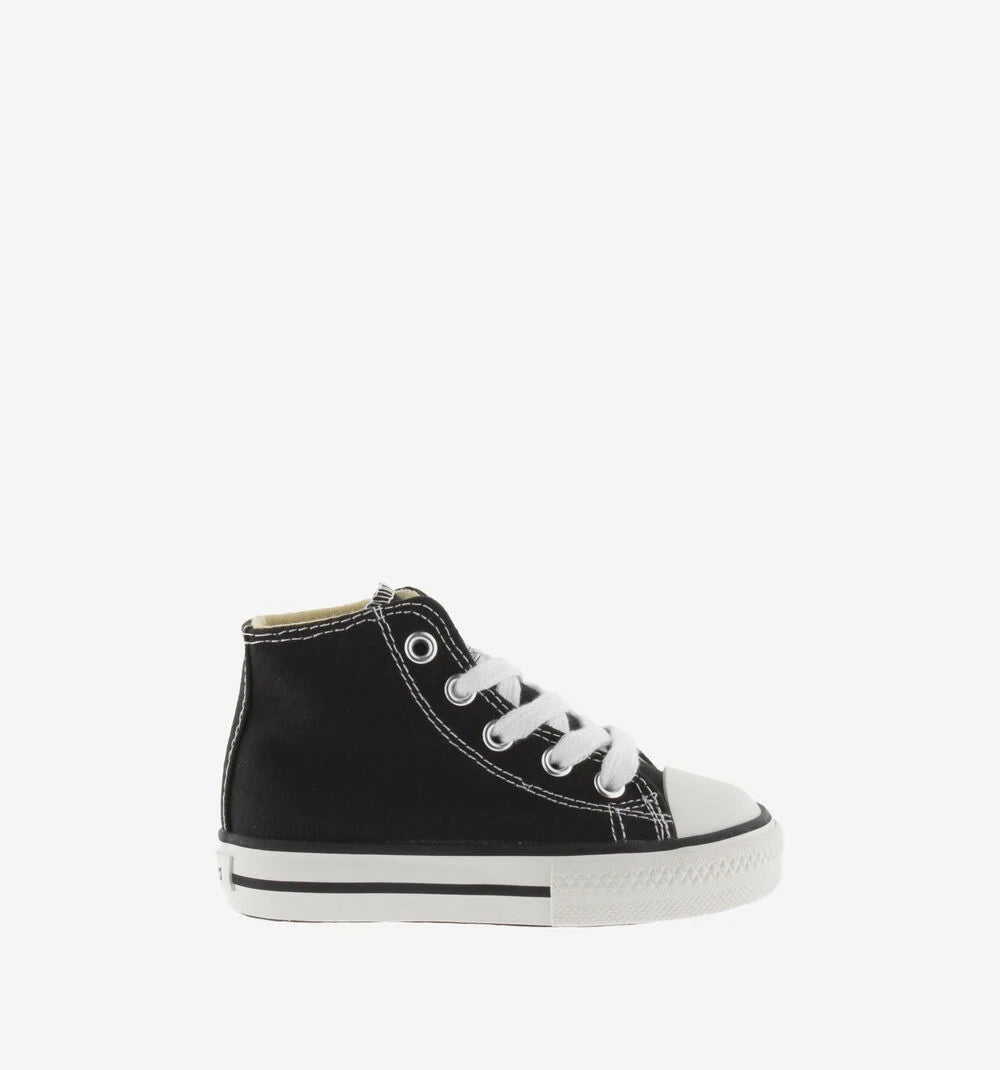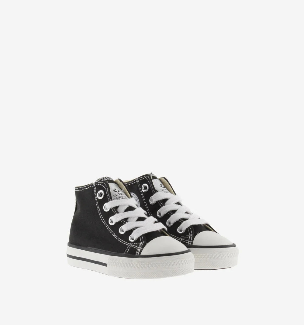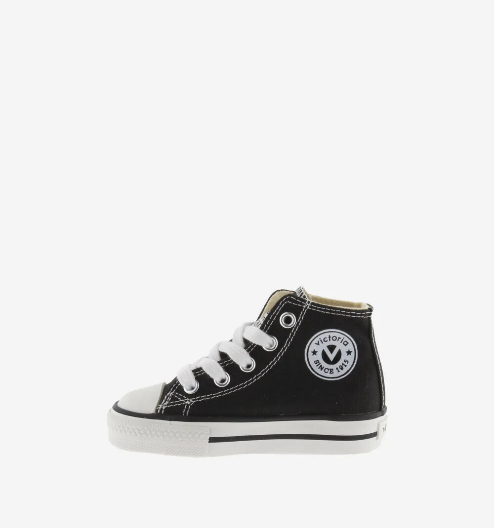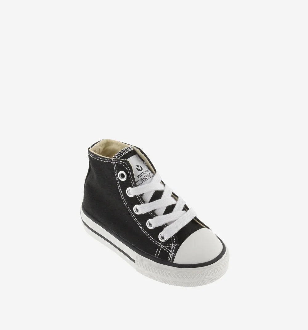 Zapatillas de caña alta de lona negra disponibles en todas las tallas. Sello de victoria impreso en el lateral en acabado brillo y etiqueta en la lengüeta. Suela de 2,5 cm y refuerzo en la puntera que las hace más resistentes y duraderas. Llevan plantilla de alta densidad para un mayor confort.