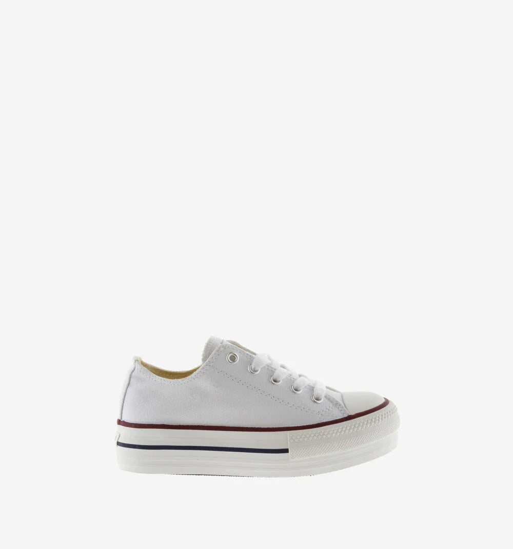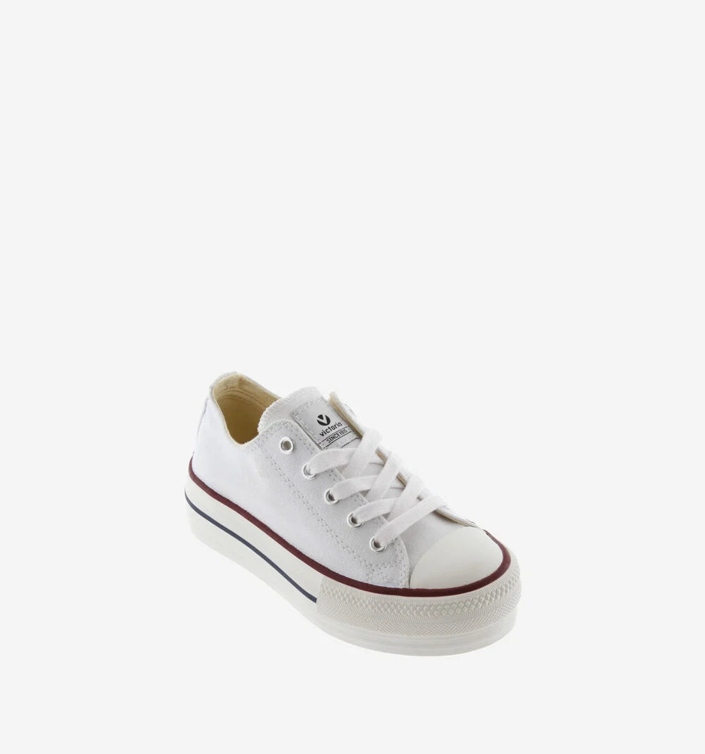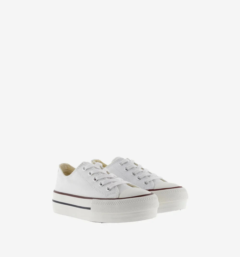 Zapatillas de lona blancas con plataforma para mujer y niña. Etiqueta de victoria en la lengüeta y cierre mediante cordones en blanco. Suela de goma con 4 cm de altura con refuerzo en la puntera que las hace más resistentes y duraderas.