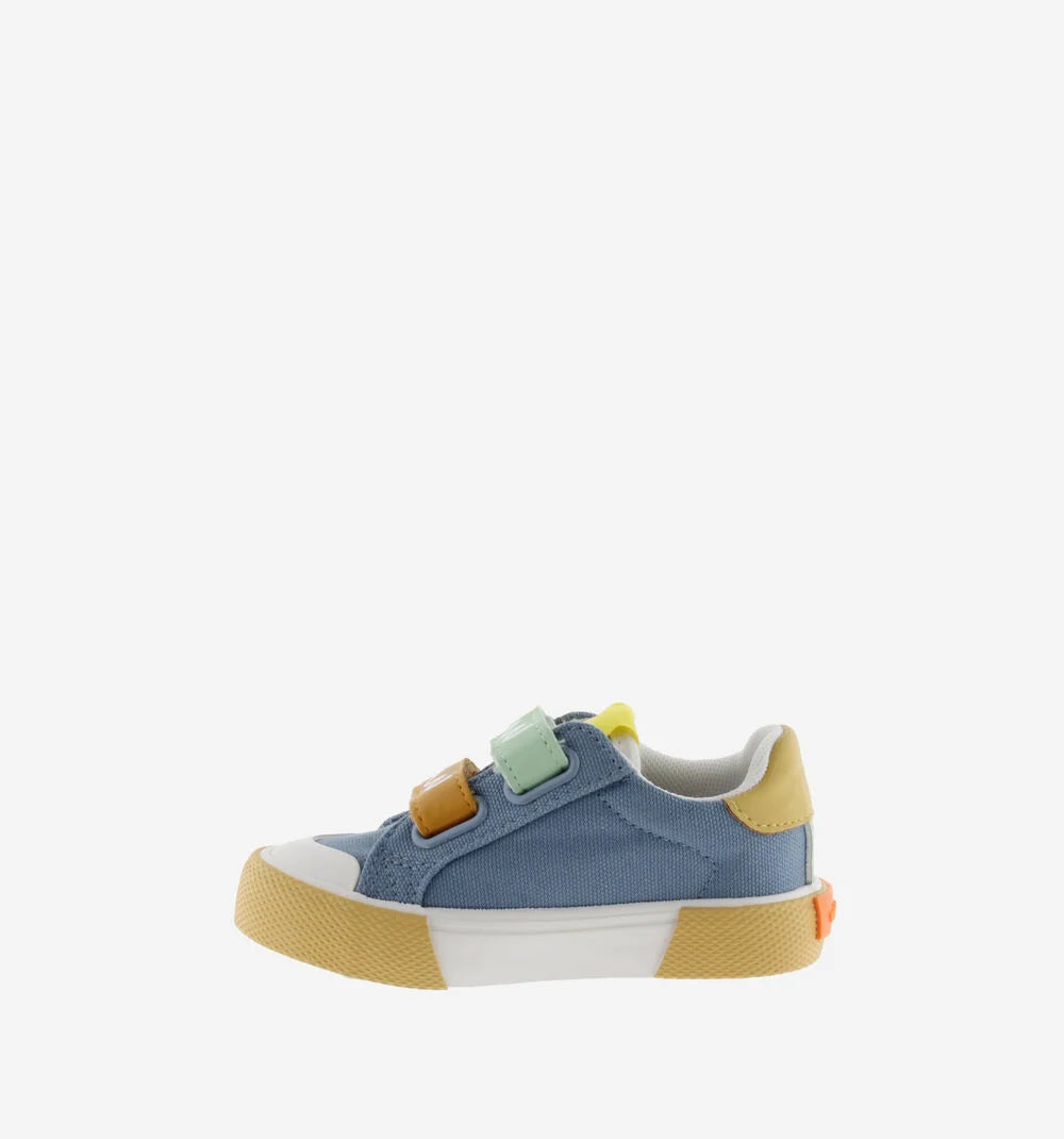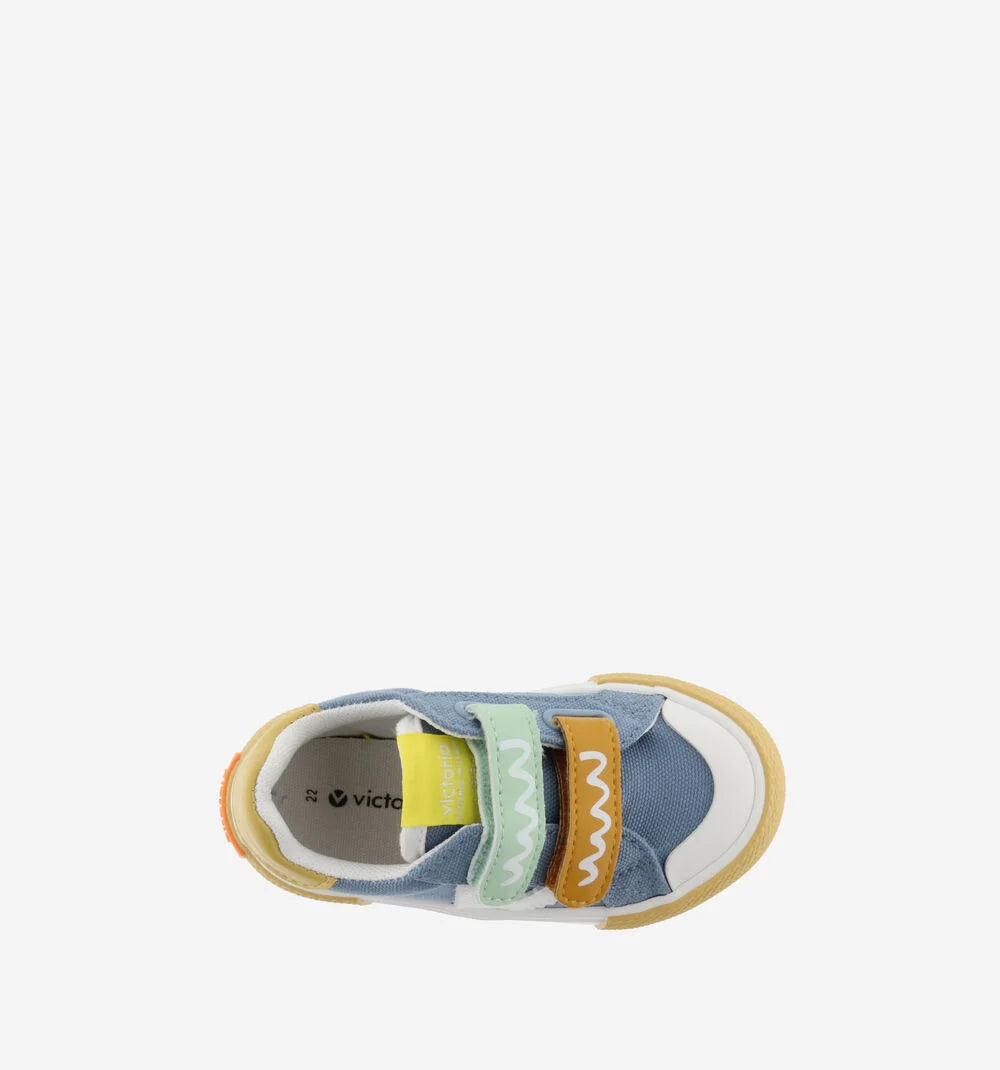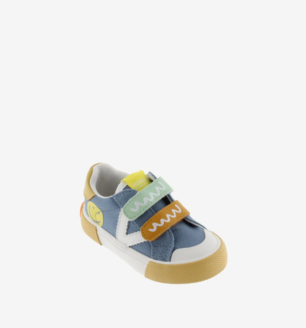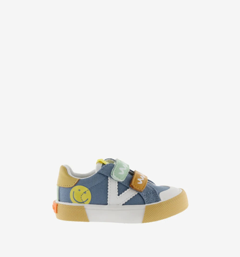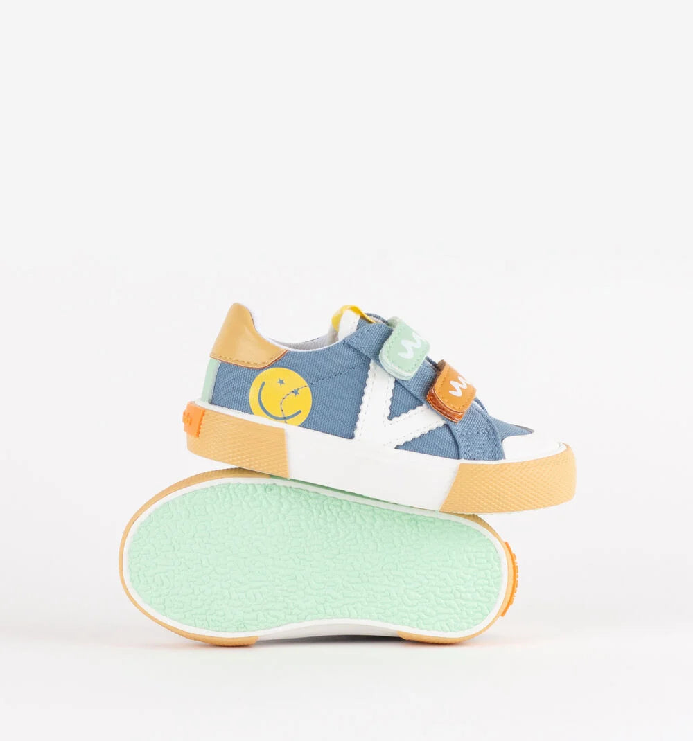 Zapatillas deportivas para niños con detalles smiley y piezas multicolor. Cierre mediante dos tiras adherentes para una mejor sujeción y facilitar el calce. Refuerzo de goma en la puntera que las hace más resistentes y duraderas. Llevan plantilla de alta densidad para un mayor confort.