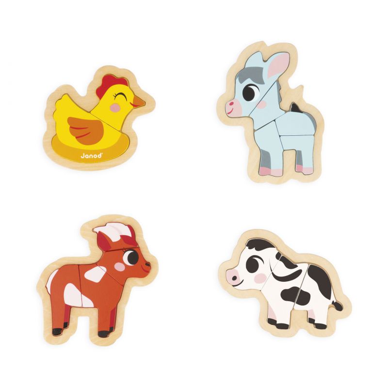 Esta bonita caja de regalo contiene 4 puzles evolutivos con la temática de la granja con: una gallina de 2 piezas, una vaca de 3 piezas, una cabra de 4 piezas y un burro de 5 piezas. A su propio ritmo, su hijo reconstruirá los diferentes puzles, aumentando su dificultad. El producto está compuesto por 4 puzles de madera dispuestos sobre 4 bases que facilitan el montaje. Ideal para desarrollar la destreza y la coordinación mano-ojo. Este producto también permite aprender los primeros números. Puzles de madera FSCTM. Para niños a partir de 18 meses.
