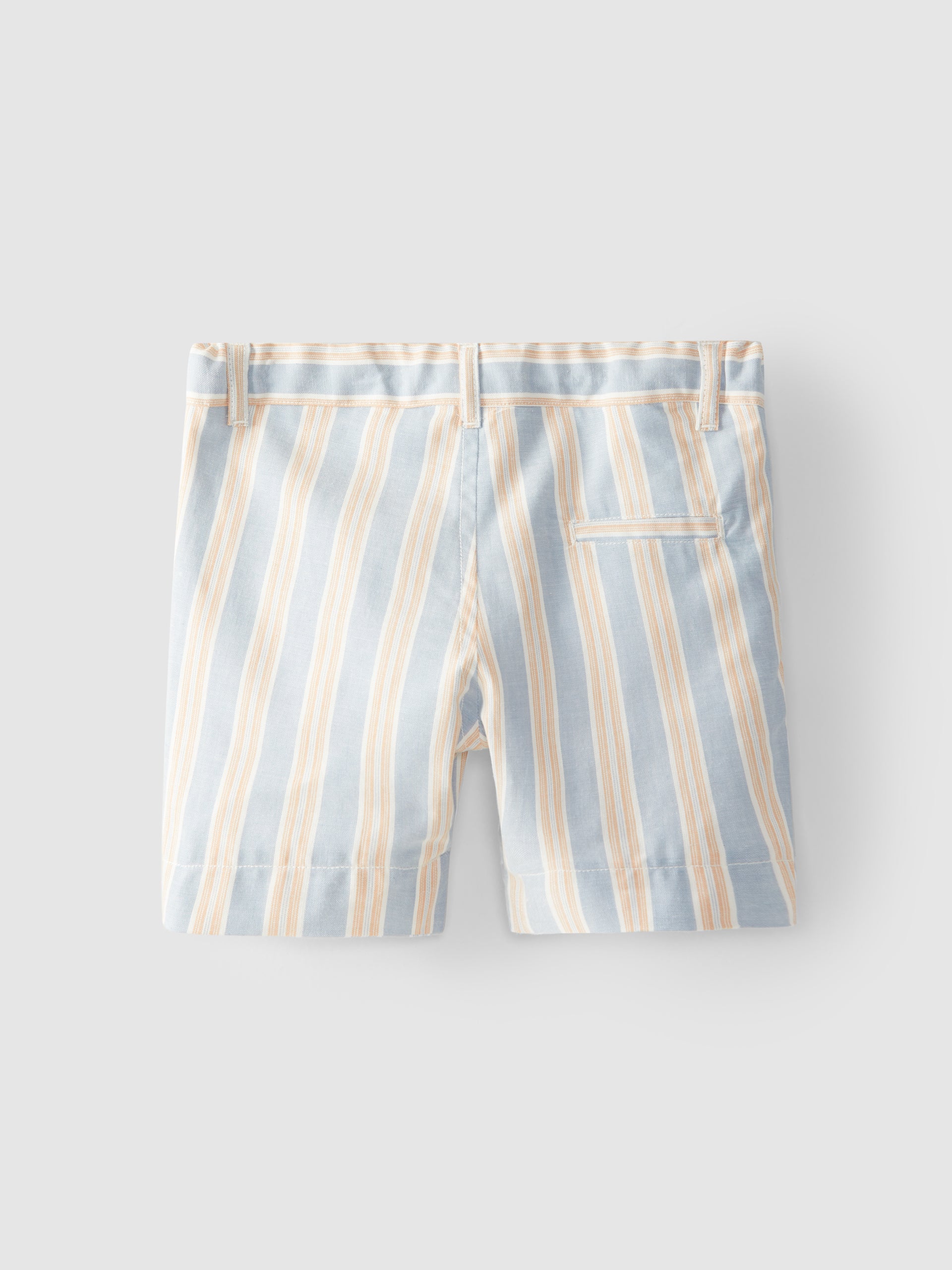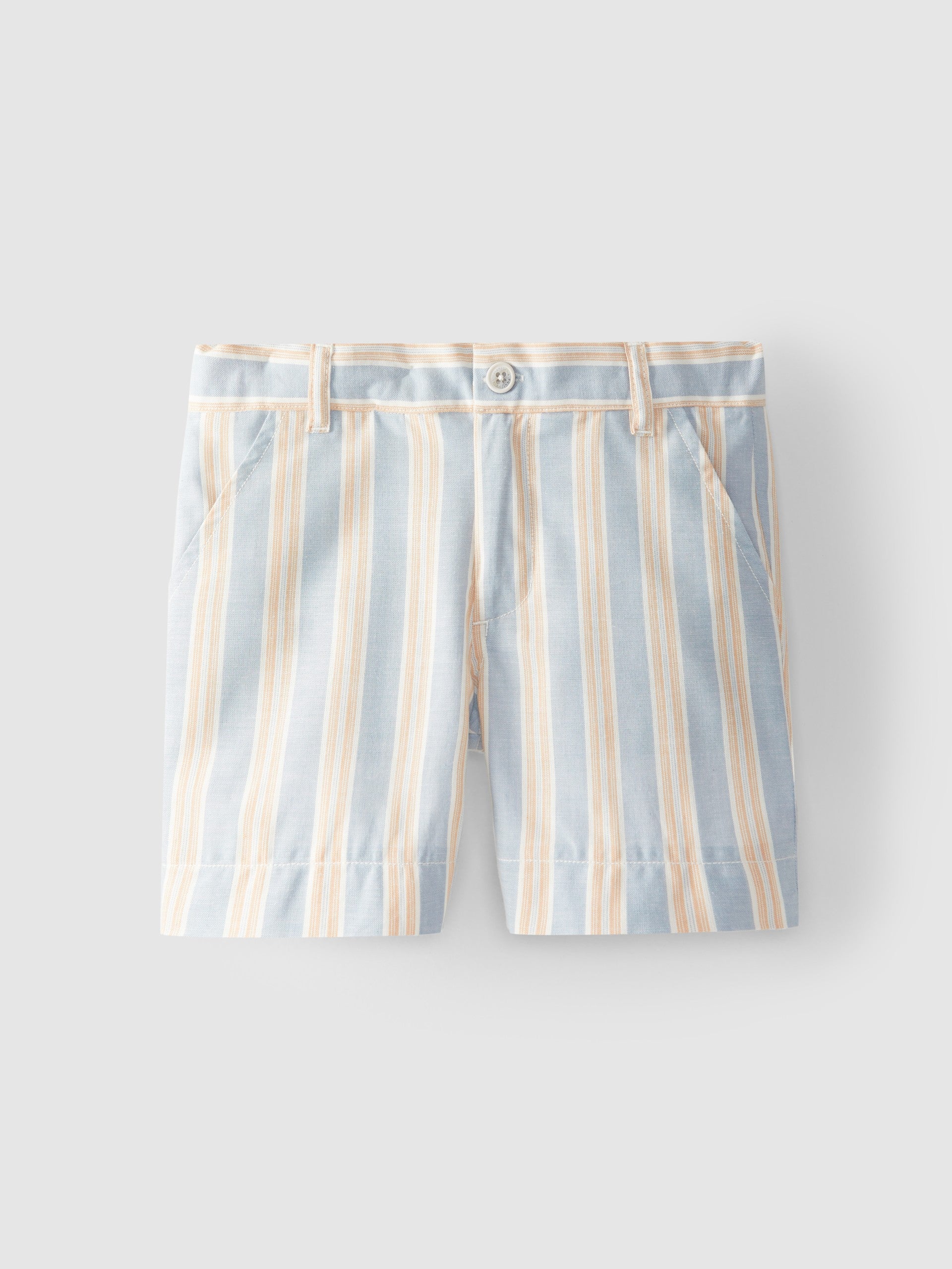 Pantalón corto en tejido 100% algodón con estampado de rayas. Se abrocha en la parte delantera con un botón y cremallera. Cintura elástica para facilitar la adaptación a la talla del niño.