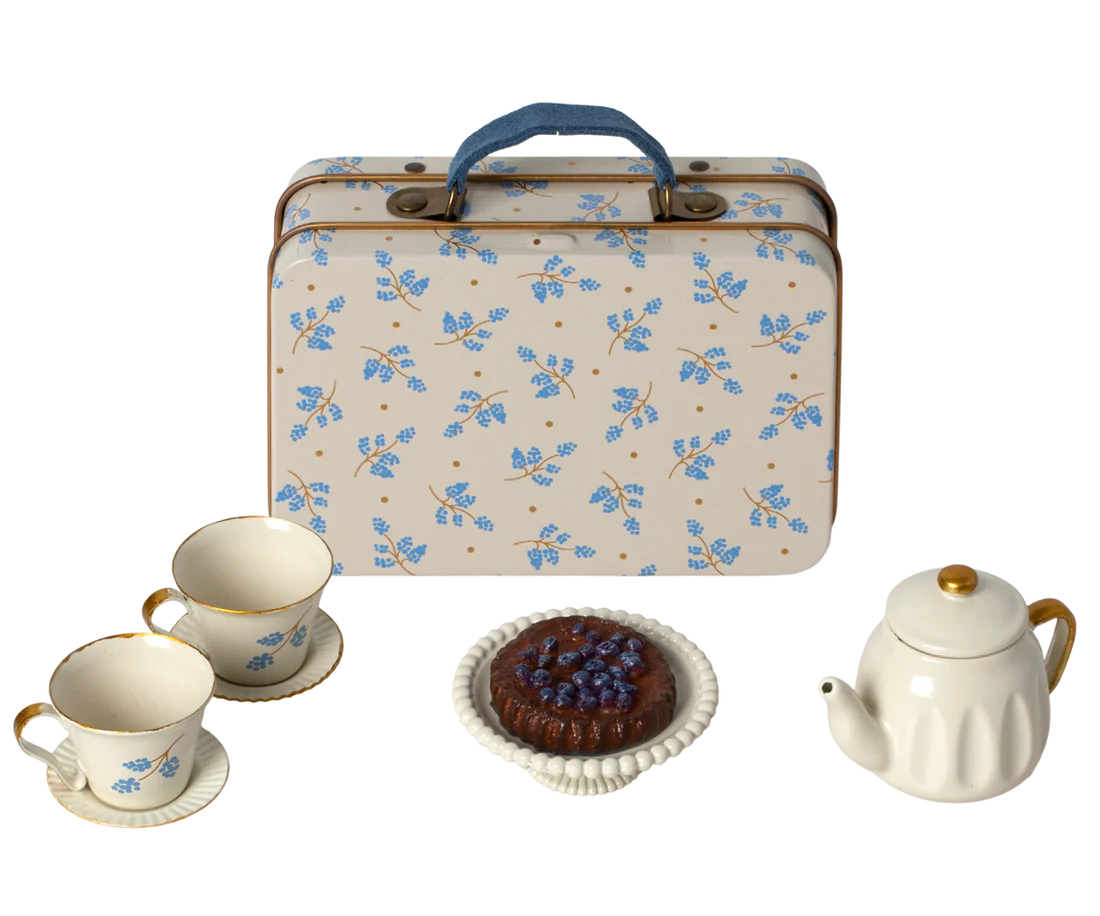 Este juego de té tiene el tamaño perfecto para la pata de un ratón. Cada juego incluye todo lo que necesitas para un momento acogedor con té, pasteles y vajilla. Se presenta en una maleta de metal, preciosa decorada con estampado Maileg.