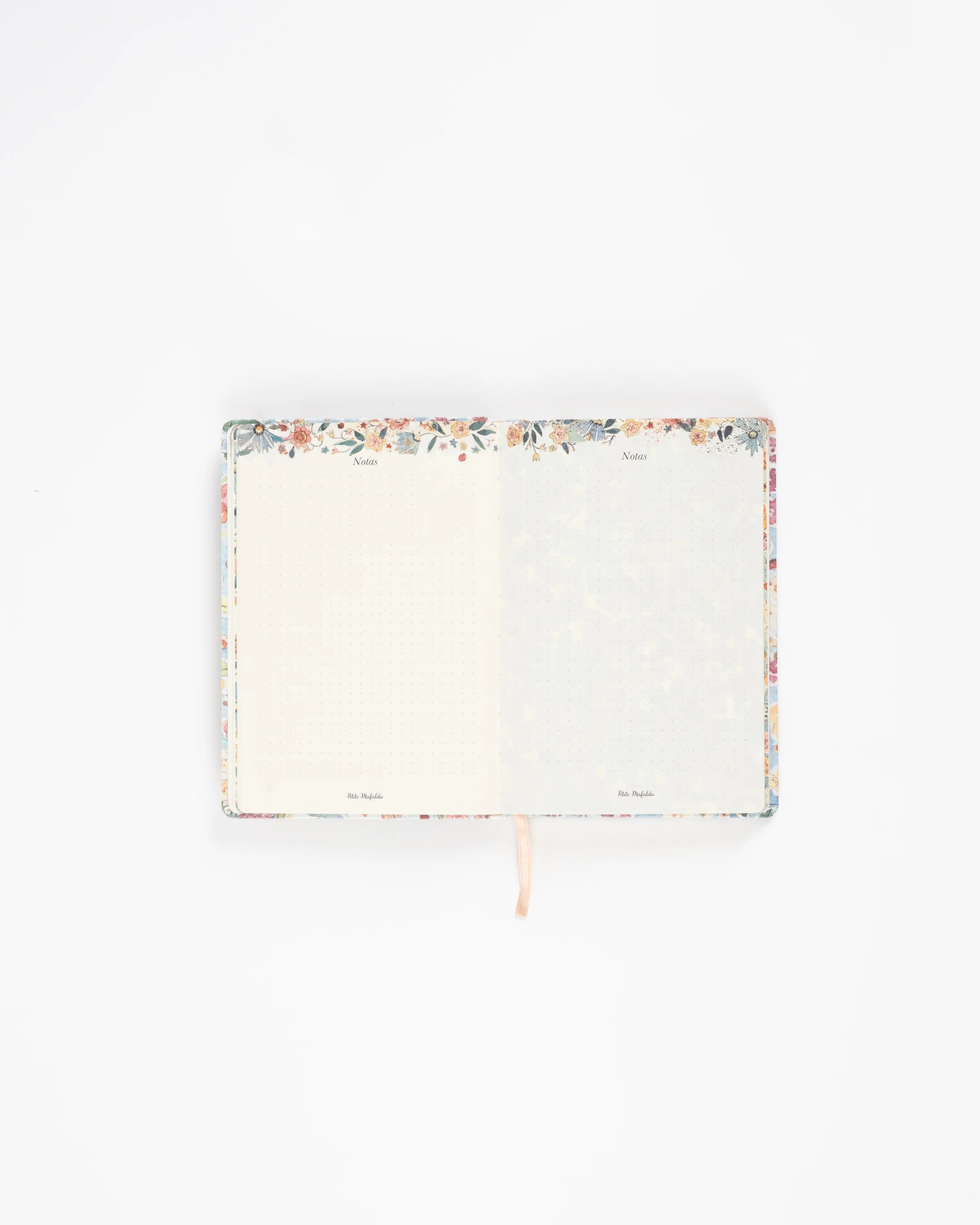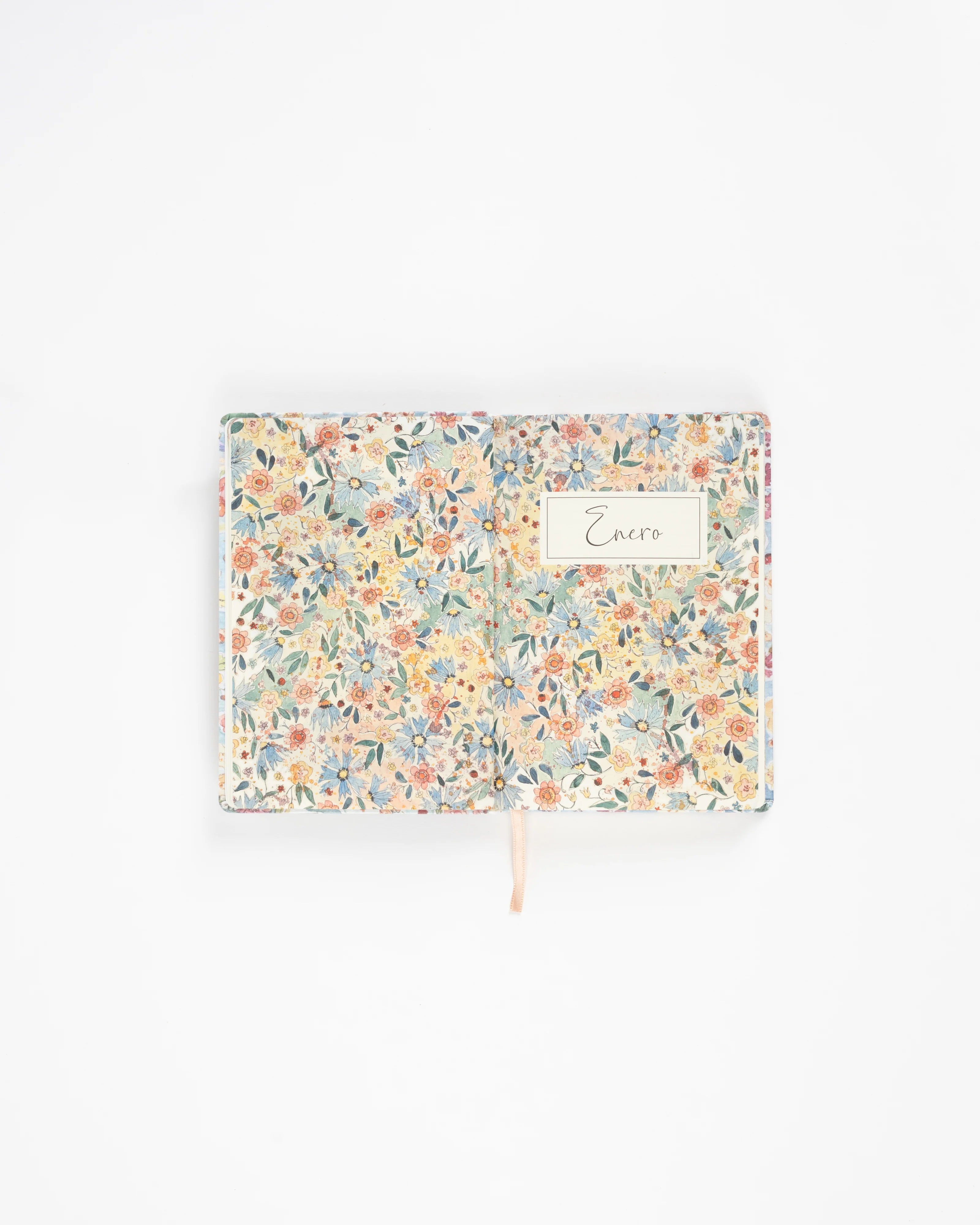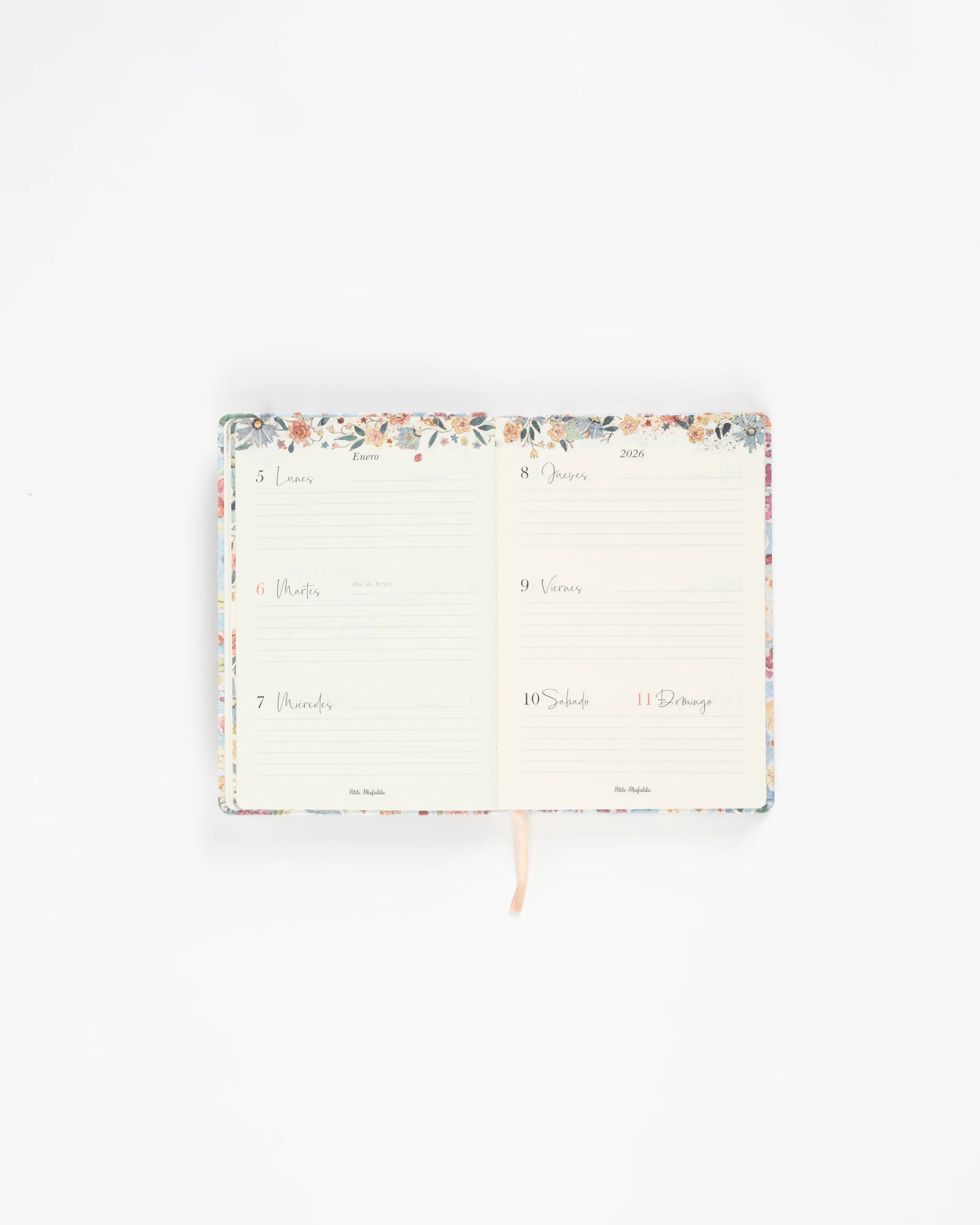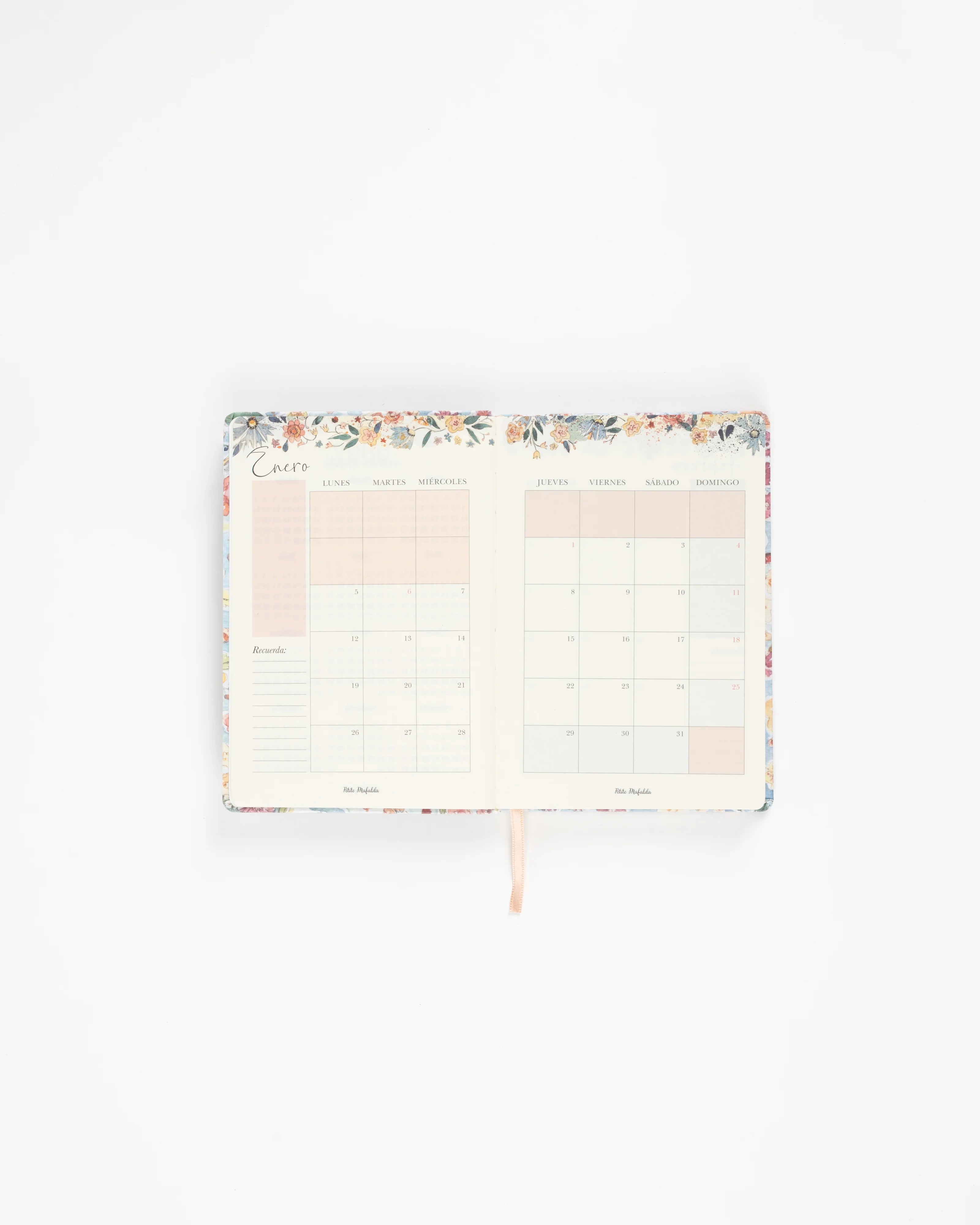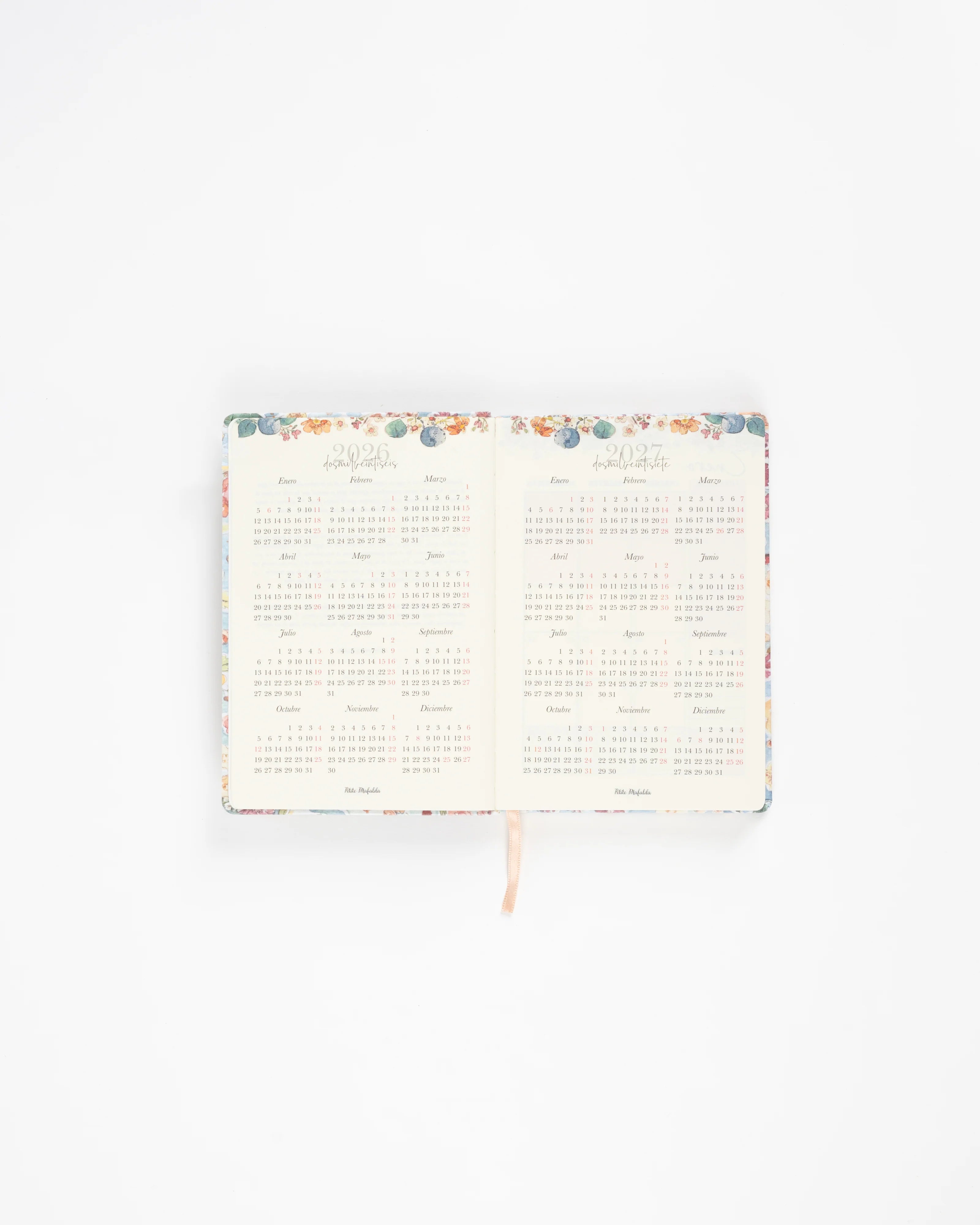 Su diseño interior presenta un calendario día por página 2026/2027 a doble página con todos los meses del año, que incluye los principales festivos y frases “petite” repartidas por toda la agenda, así como un estampado de flores para cada mes.